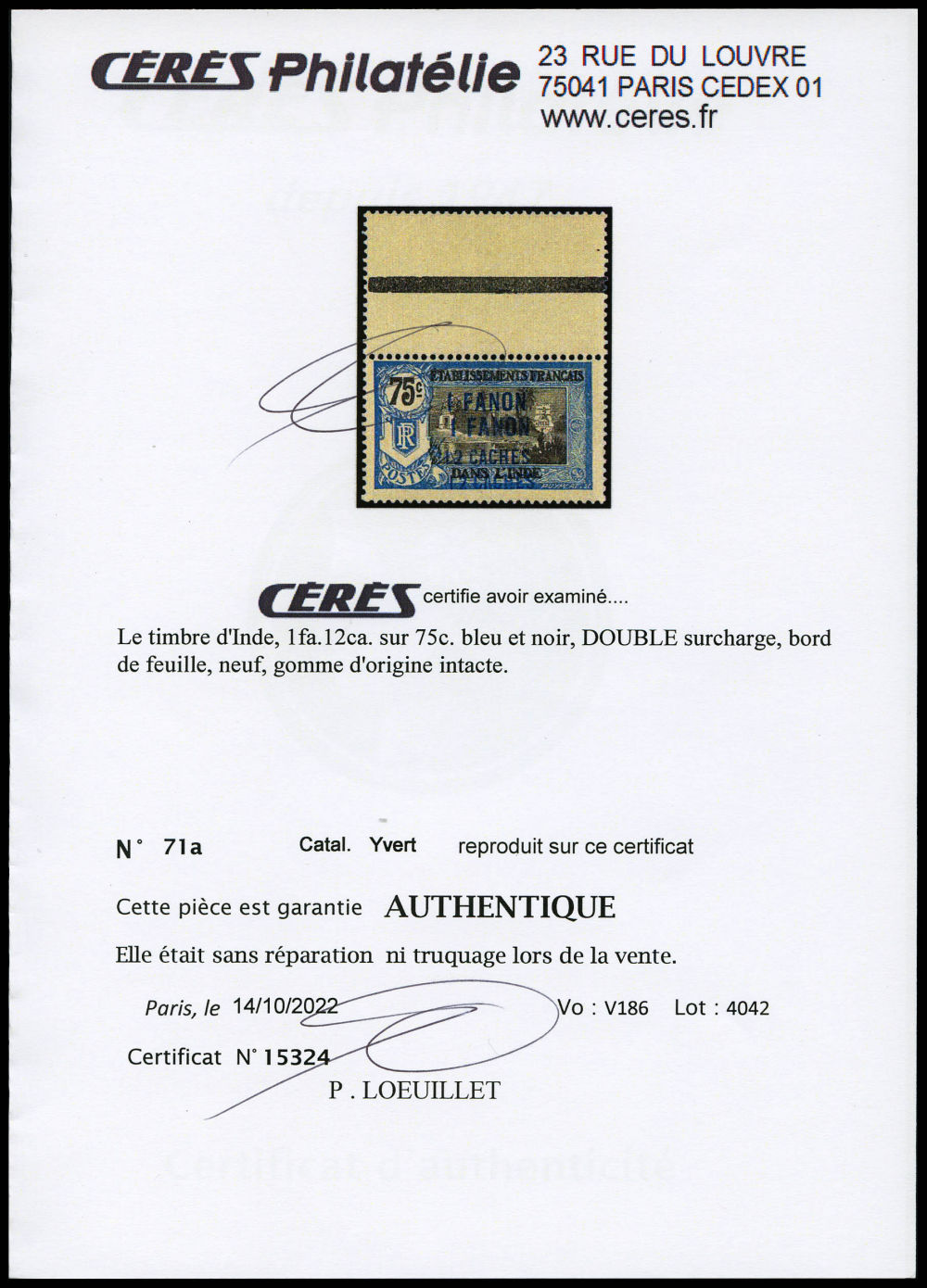 N°71a, 1fa.12ca sur 75c bleu noir: Double surcharge, bord de feuille. SUP (certificats) Qualité: ** Cote: 370 euros (Image) (imagea)