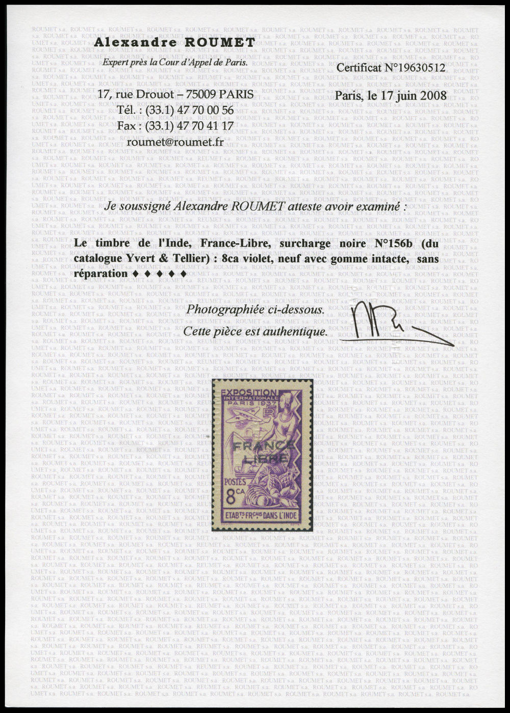 N°156b, 8 ca violet, surcharge f noire. SUPERBE. R. (signé Brun/certificat) Qualité: ** Cote: 1650 euros (Image) (imagea)
