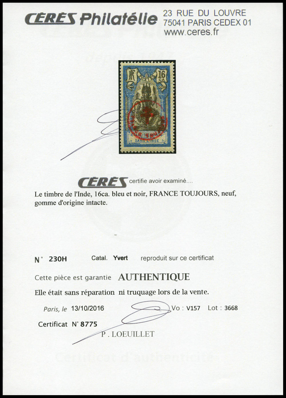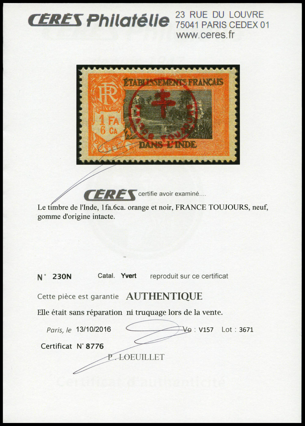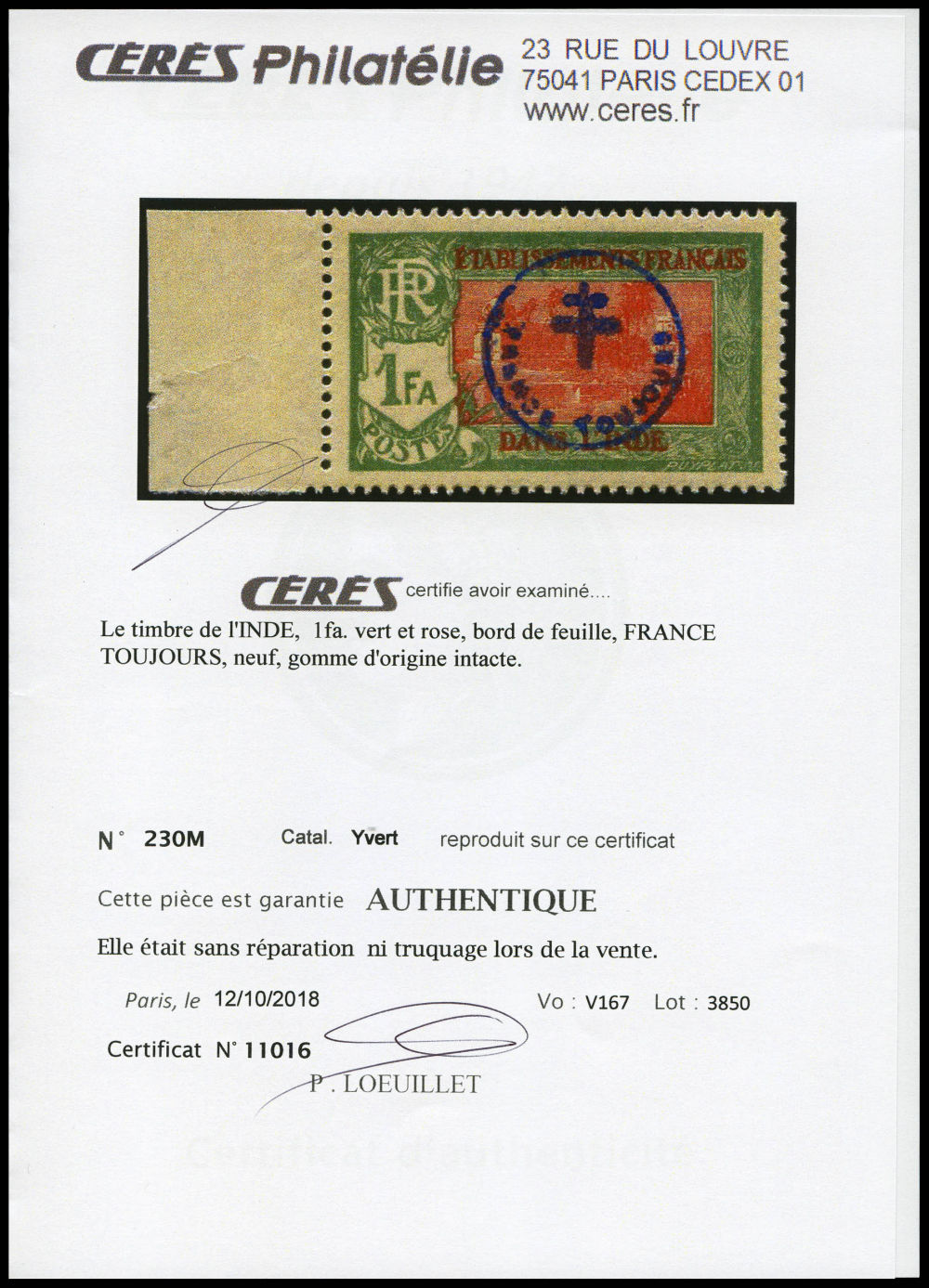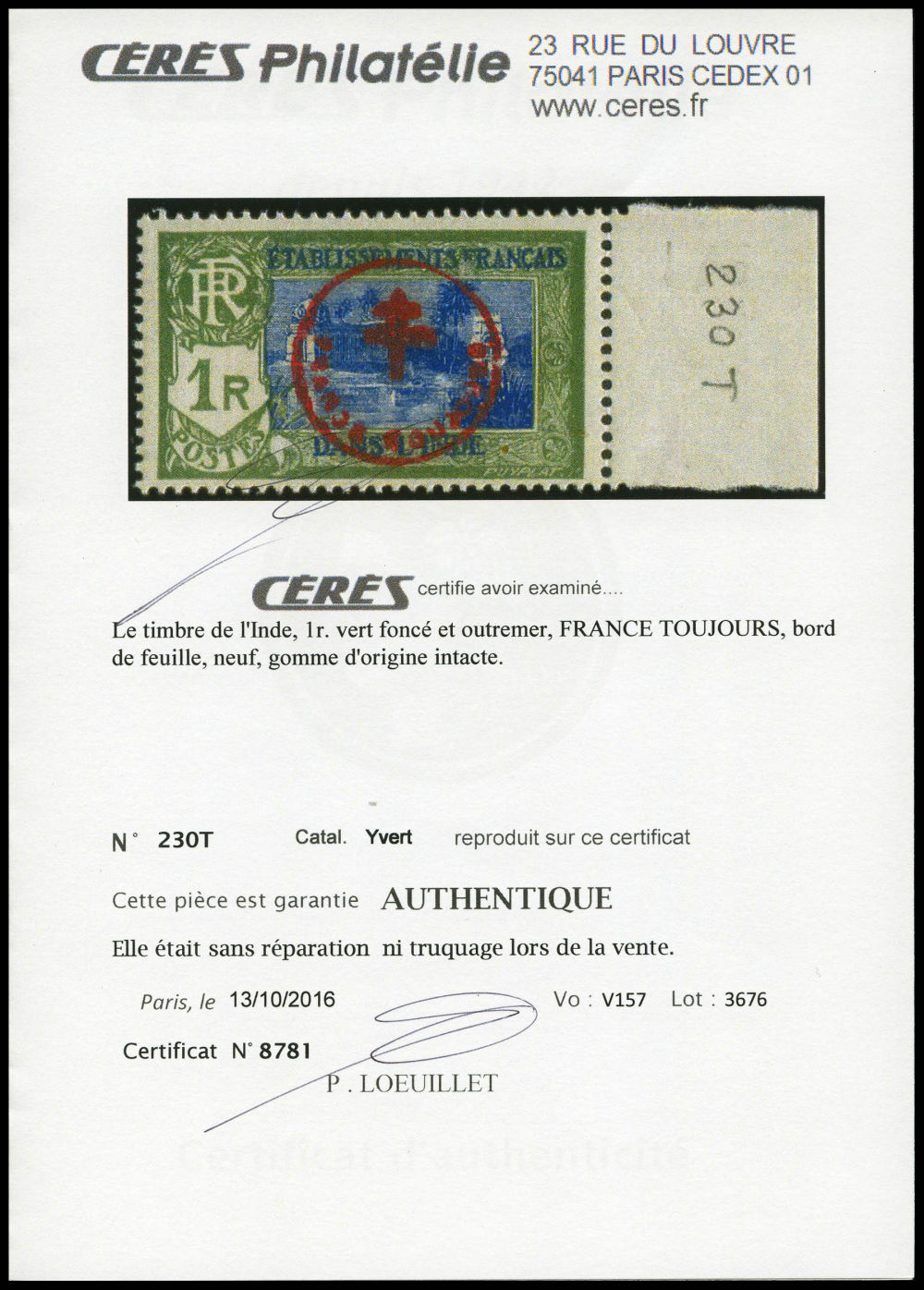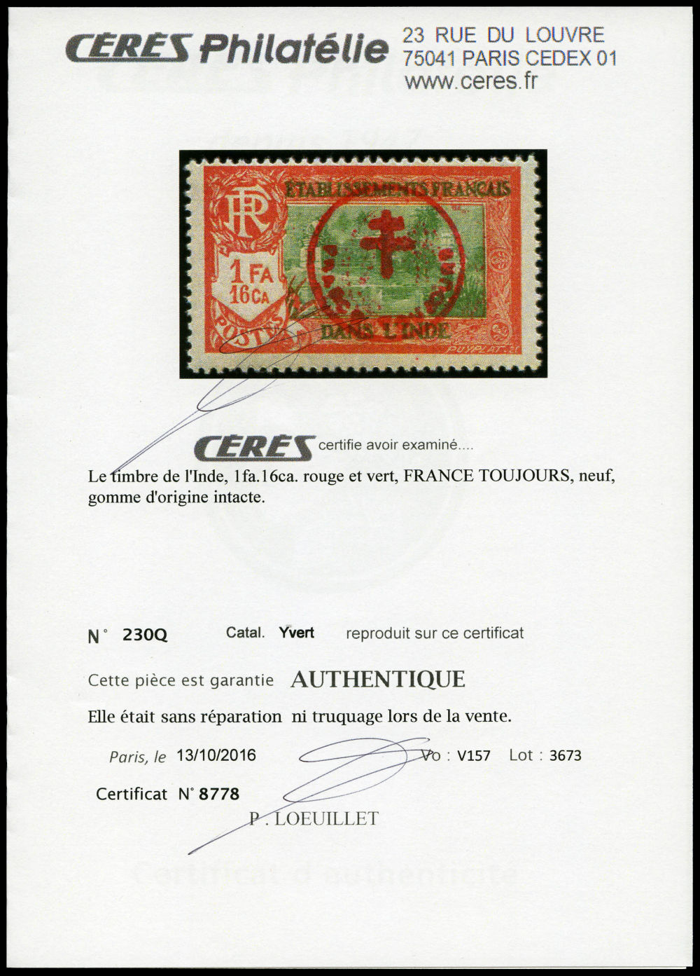 N°230Q, 'FRANCE TOUJOURS': 1 fa. 16ca rouge et vert. SUP. R. (certificats) Qualité: ** Cote: 1900 euros (Image) (imagea)