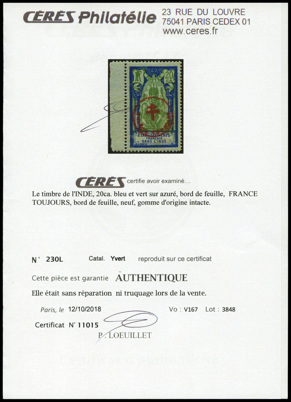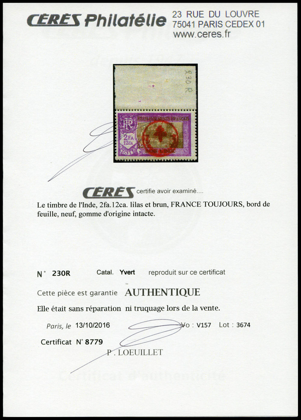 N°230R, 'FRANCE TOUJOURS': 2 fa. 12ca. bord de feuille. SUP (certificats) Qualité: ** Cote: 1900 euros (Image) (imagea)