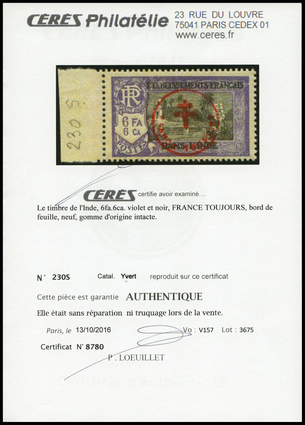 N°230S, 'FRANCE TOUJOURS': 6 fa. 6ca violet et noir, bord de feuille latéral. SUP. R. (certificats) Qualité: ** Cote: 1900 euros (Image) (imagea)