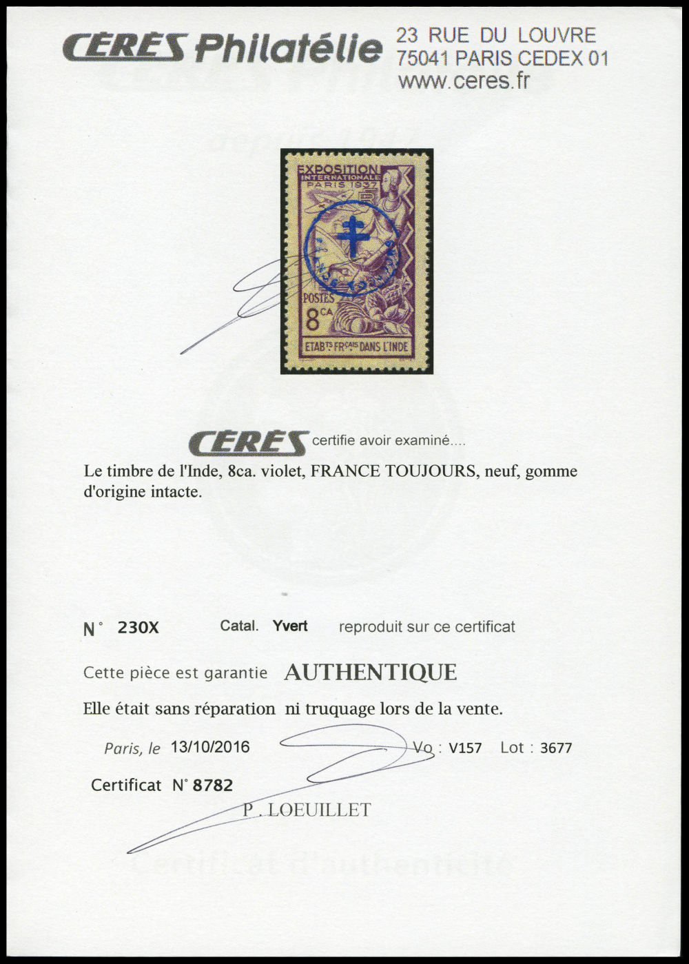 N°230X, 'FRANCE TOUJOURS': 8ca. violet. SUP. R. (certificats) Qualité: ** Cote: 1900 euros (Image) (imagea)