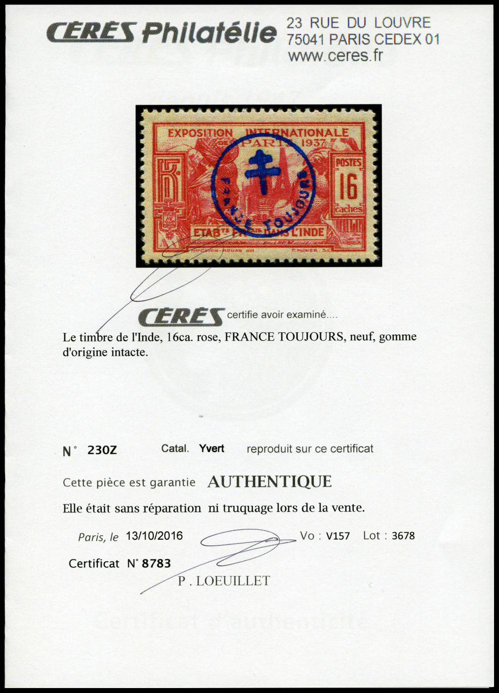 N°230Z, 'FRANCE TOUJOURS': 16 ca. rose. SUP. R. (certificats) Qualité: ** Cote: 1900 euros (Image) (imagea)