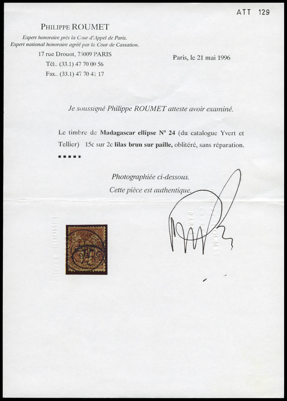3540 imageN°24, 15c sur 2c lilas-brun s paille, léger pli mais belle présentation (signé Calves/Scheller/certificat) Qualité: Oblitéré Cote: 1550 euros (Image) (imagea) (All Images)
