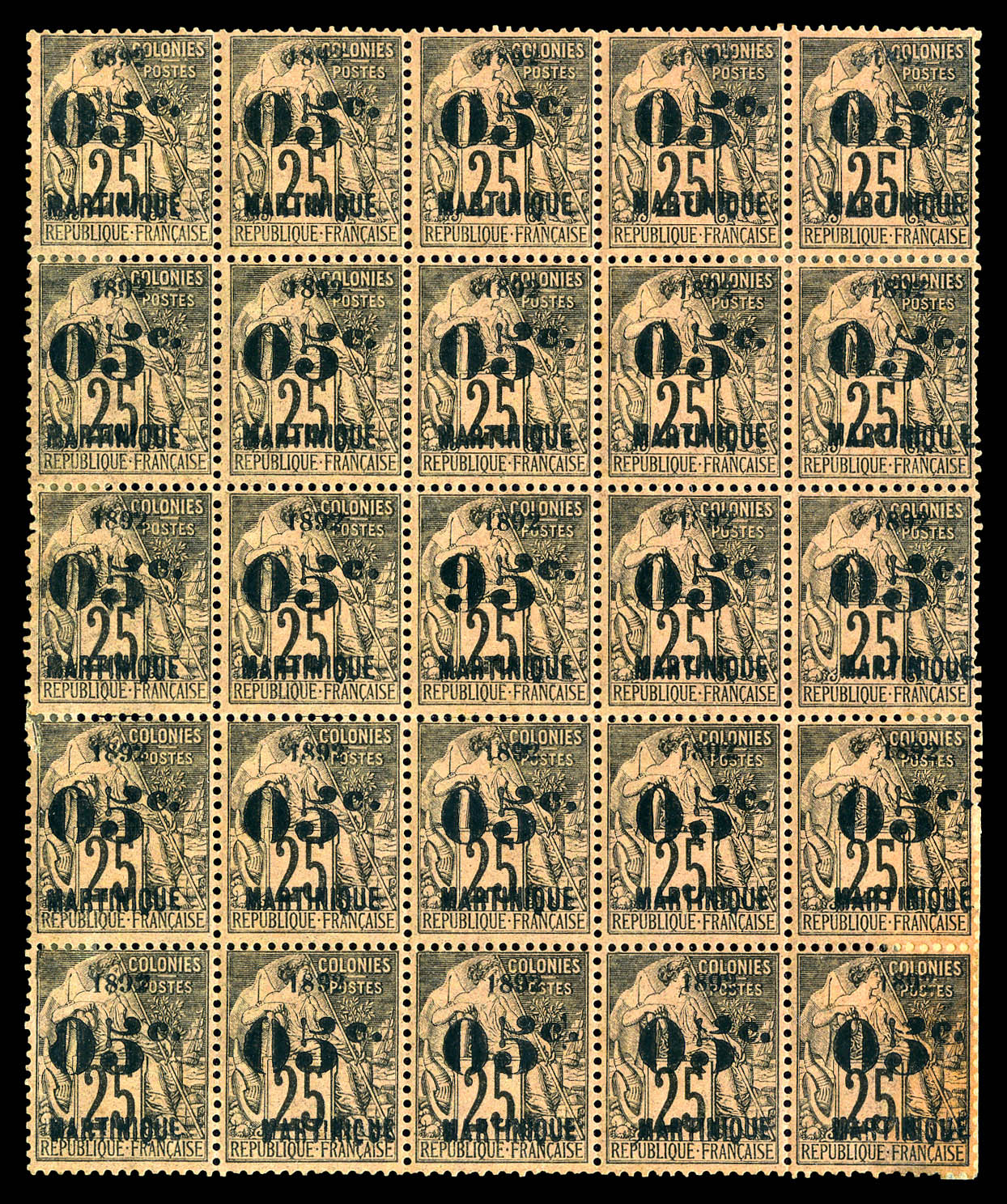 N°29aa/ba, 95c au lieu de 05c au centre d'un bloc de 25 exemplaires + variété 5 penché, qqs ex adhérences ou *. SUP. R. (certificat)