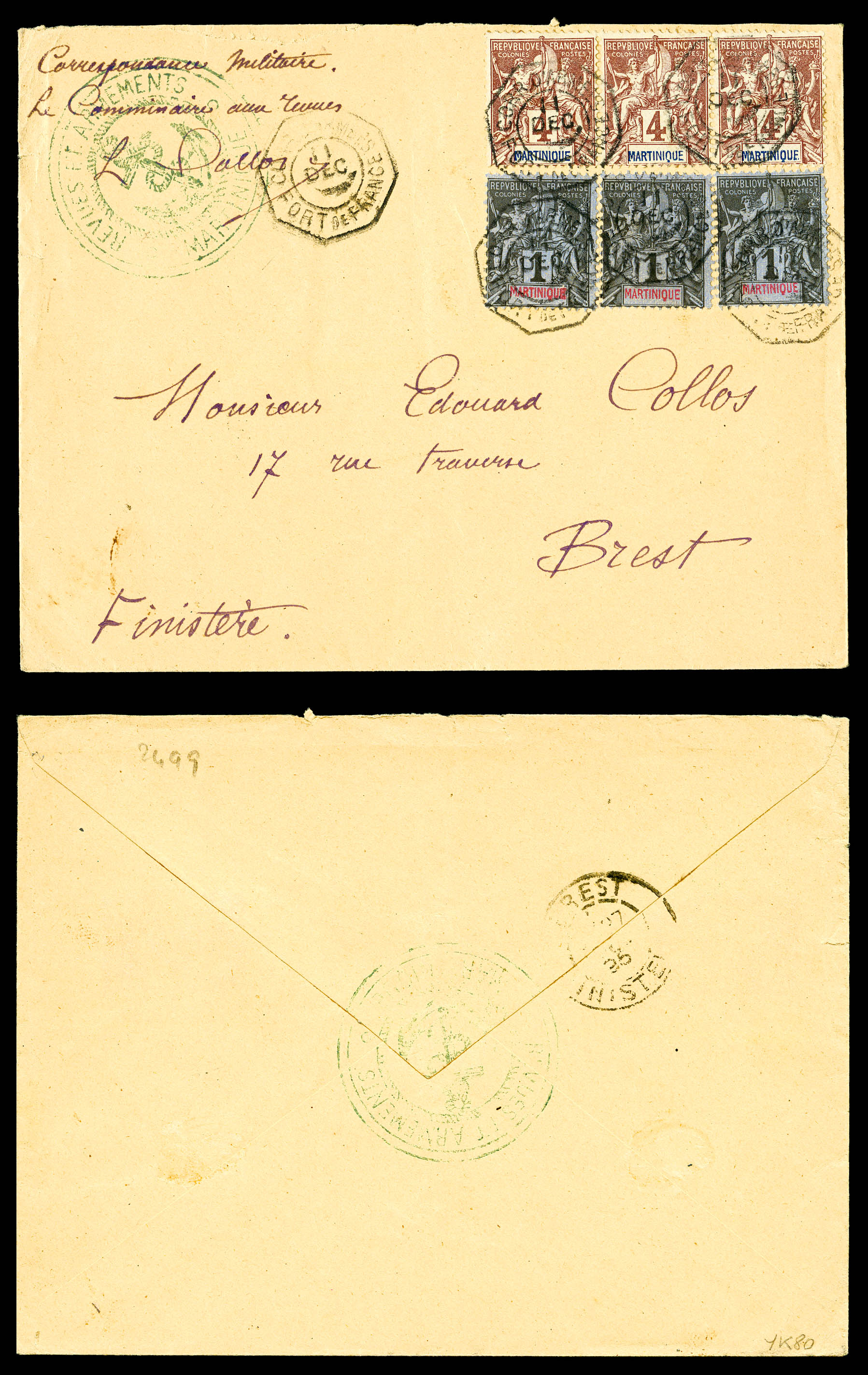 Correspondance Militaire: 1c noir sur azuré x 3ex + 4c lilas-brun sur gris x 3ex obl Càd octogonal Corr D'Armée/Fort de France +