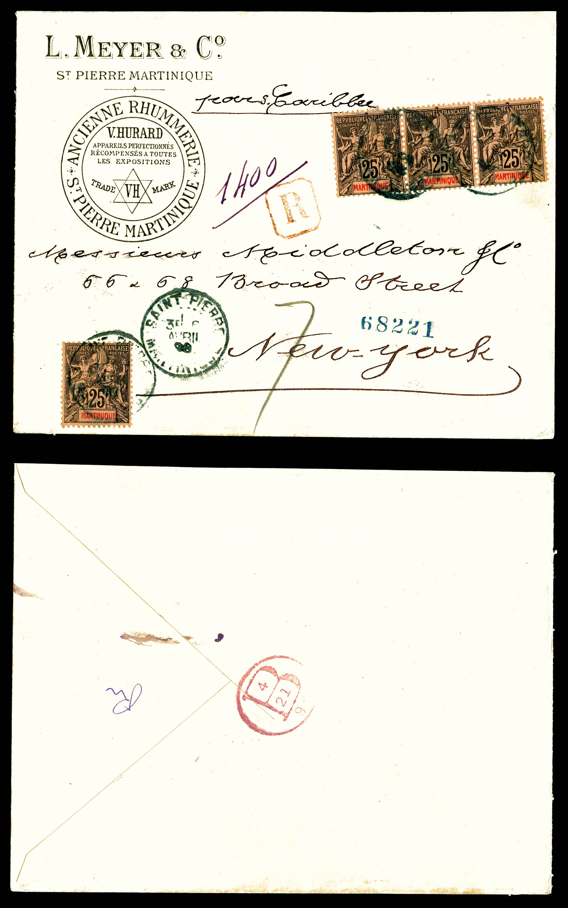 N°38, 25c noir sur rose x4 exemplaires obl càd bleu Saint Pierre/Martinique sur lettre illustrée triple port recommandée du 6 avril