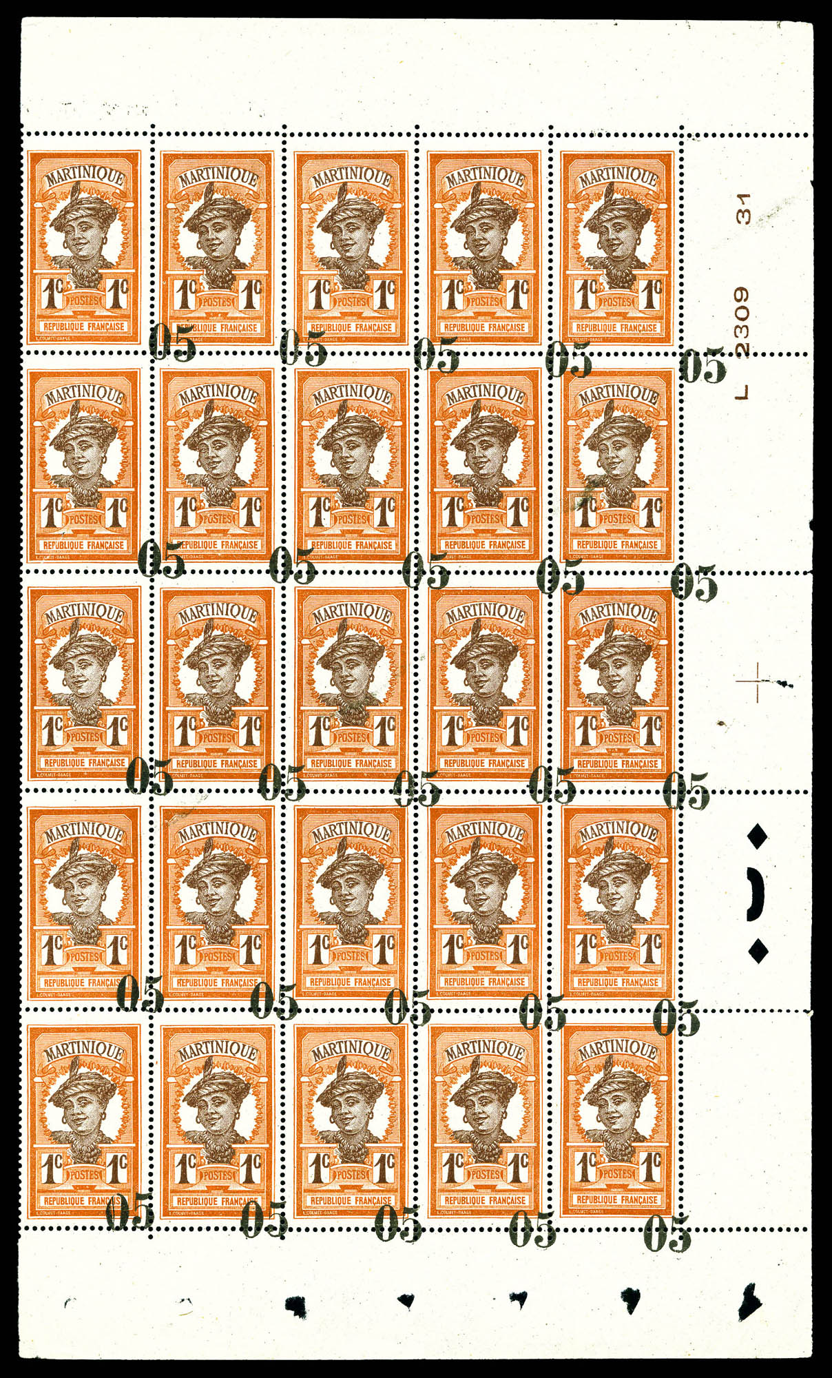 N°83, Surcharge très déplacée sur panneau de 25 ex encadré sur 3 côtés dont exemplaires sans surcharges. SUP. R. (signés