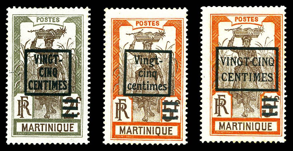 3683 og imageEssais de surcharge 'VINGT-CINQ CENTIMES' en noir: N°112 sur 2 et 3 lignes (2ex) et N°113 sur 3 lignes, non catalogués, les 3 exemplaires TTB. R. (certificat) Qualité: * (Image)