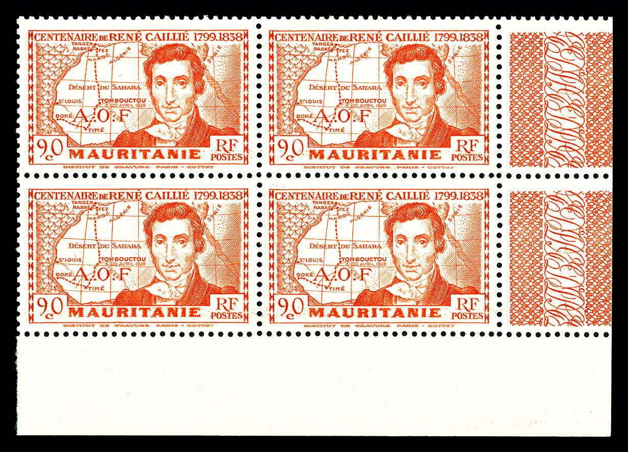 3694 nh imageN°95a, René Caillié, 90c rouge terne, GRANDE LEGENDE en bloc de quatre cdf, SUP (certificat) Qualité: ** Cote: 3140 euros (Image)
