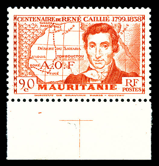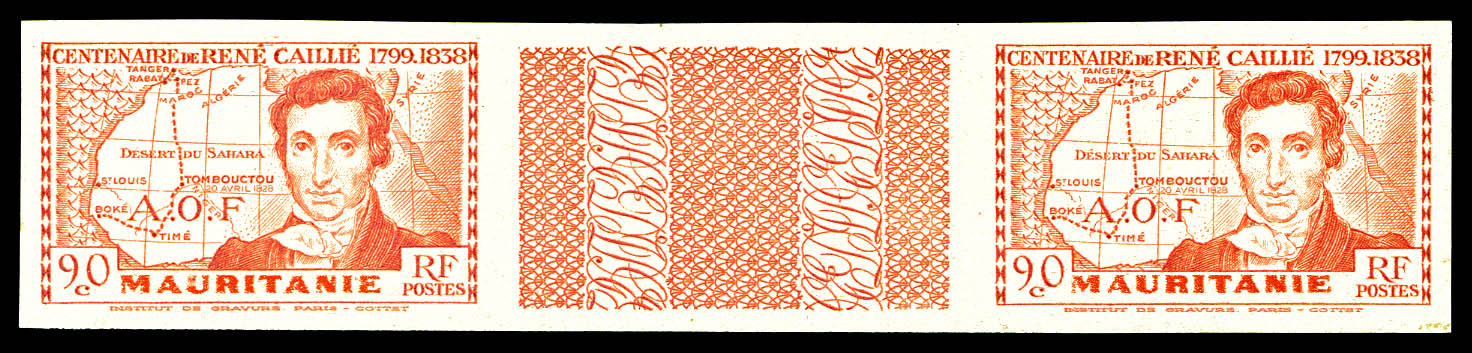 3696 nh imageN°95, 90c René Caillé, paire non dentelée avec interpanneau dont Variété Grande légende, 10 exemplaires connus. SUPERBE. R.R. (certificat) Qualité: ** (Image)
