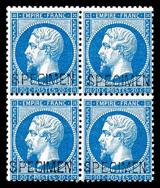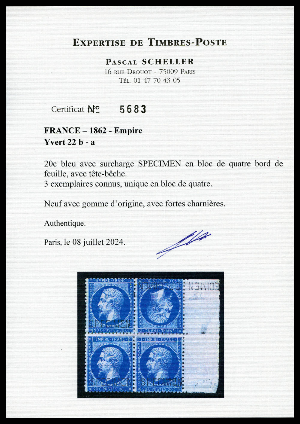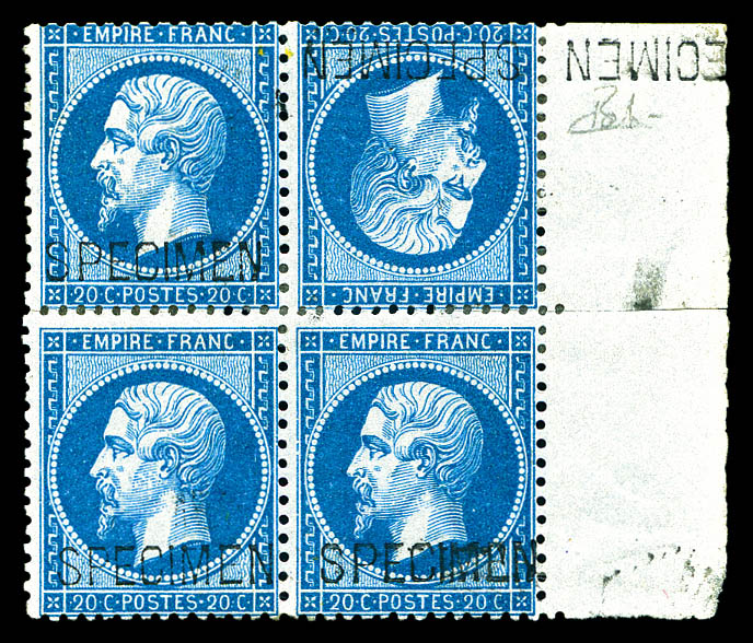 N°22ba, 20c bleu surchargé 'SPECIMEN': tête-bêche tenant à normaux en bloc de quatre bord de feuille. Ce tête-bêche est un des plus rare de France. Pièce unique en bloc de 4. SUPERBE. R.R.R. (certificats)