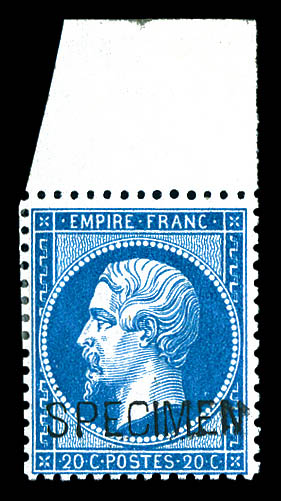 N°22d, 20c bleu surchargé 'SPECIMEN', bdf. TB Qualité: * Cote: 410 euros (Image)