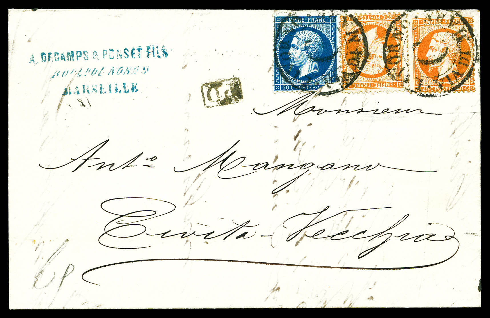 1865, Empire Dentelé: 20c (def) +40c. 2 pièces obl Grand cachet à date Livorno C Via di Mare sur lettre double port pour Civita Vecchia (ex Vente Thiaude 1977, lot 653) . RARETEE. SUPERBE (certificat) Qualité: