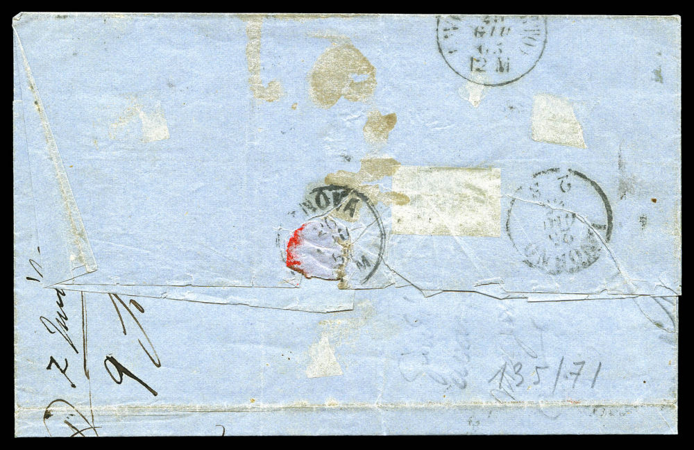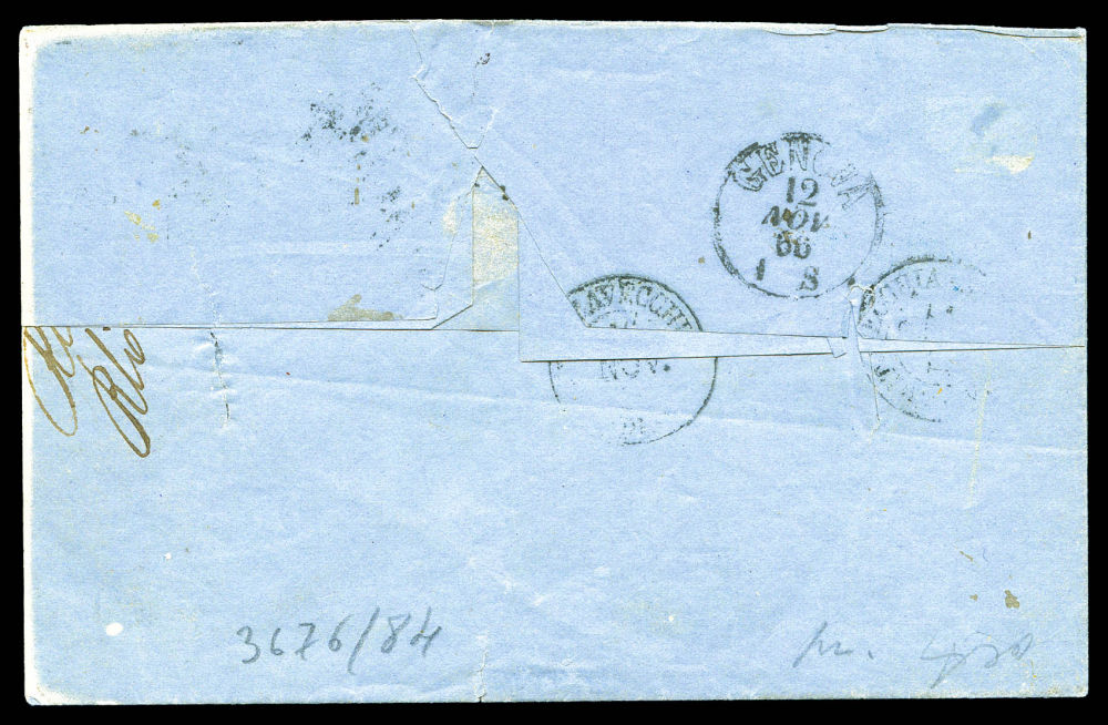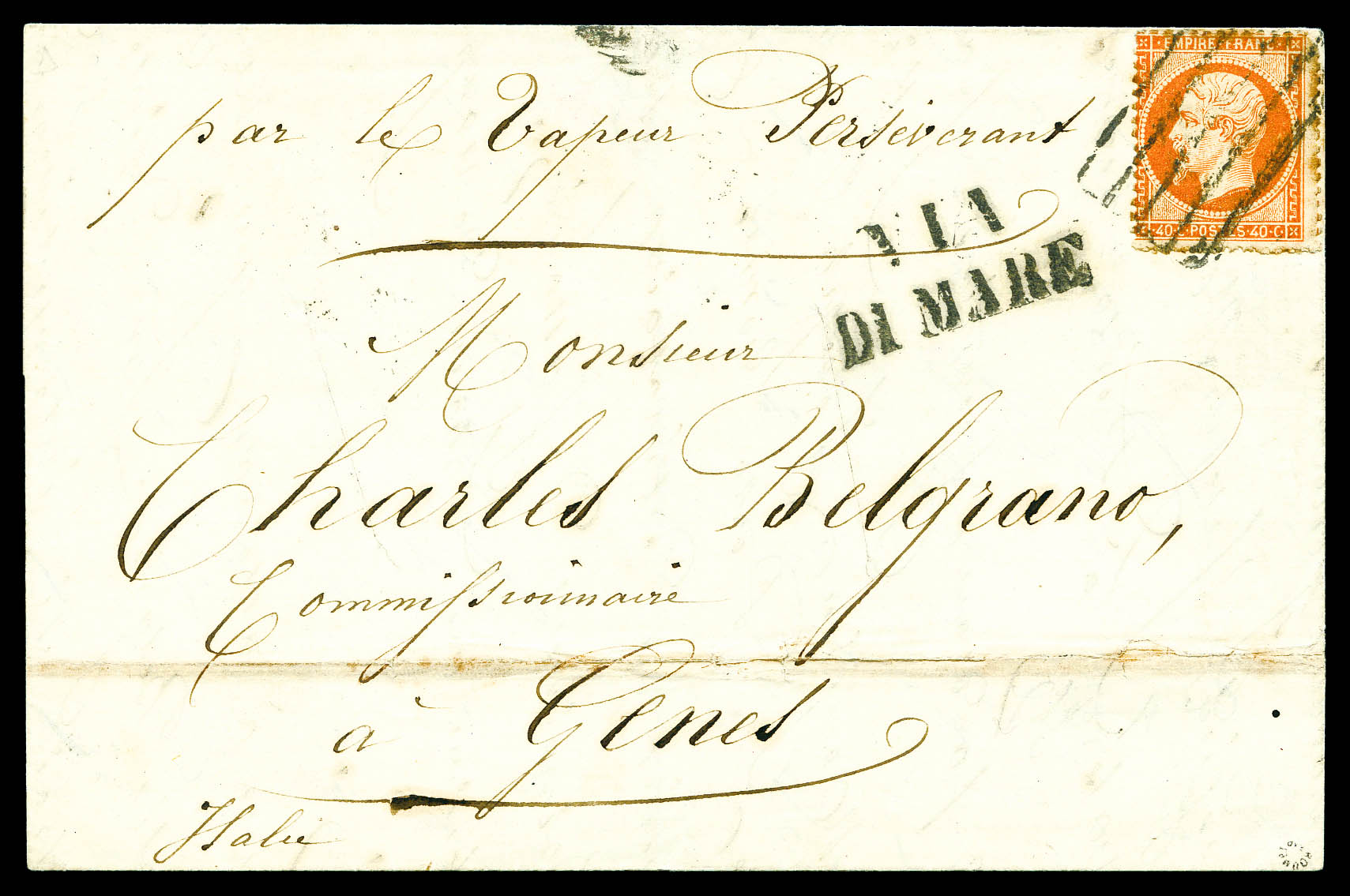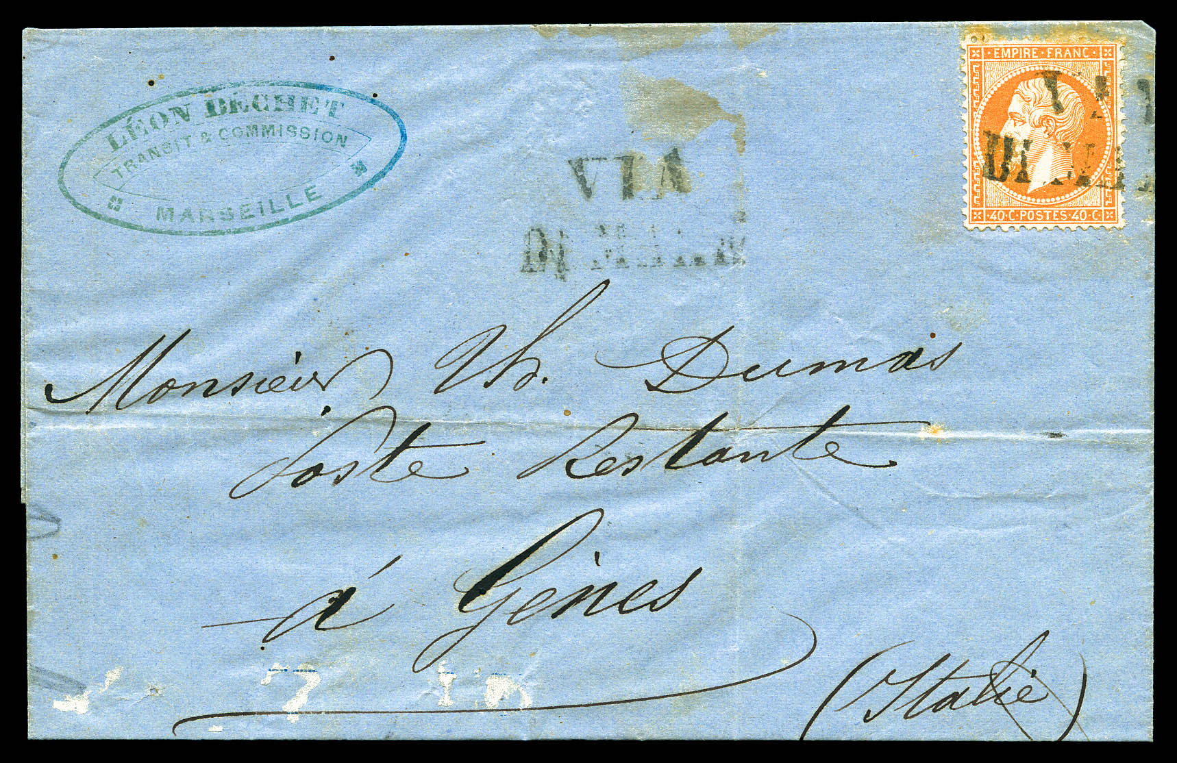N°23, 1865, 40c Empire dentelé obl GRAND VIA DI MARE en noir sur lettre de MARSEILLE pour GENES, RARE et SUPERBE. (certificat) Qualité: Oblitéré (Image) (imagea)