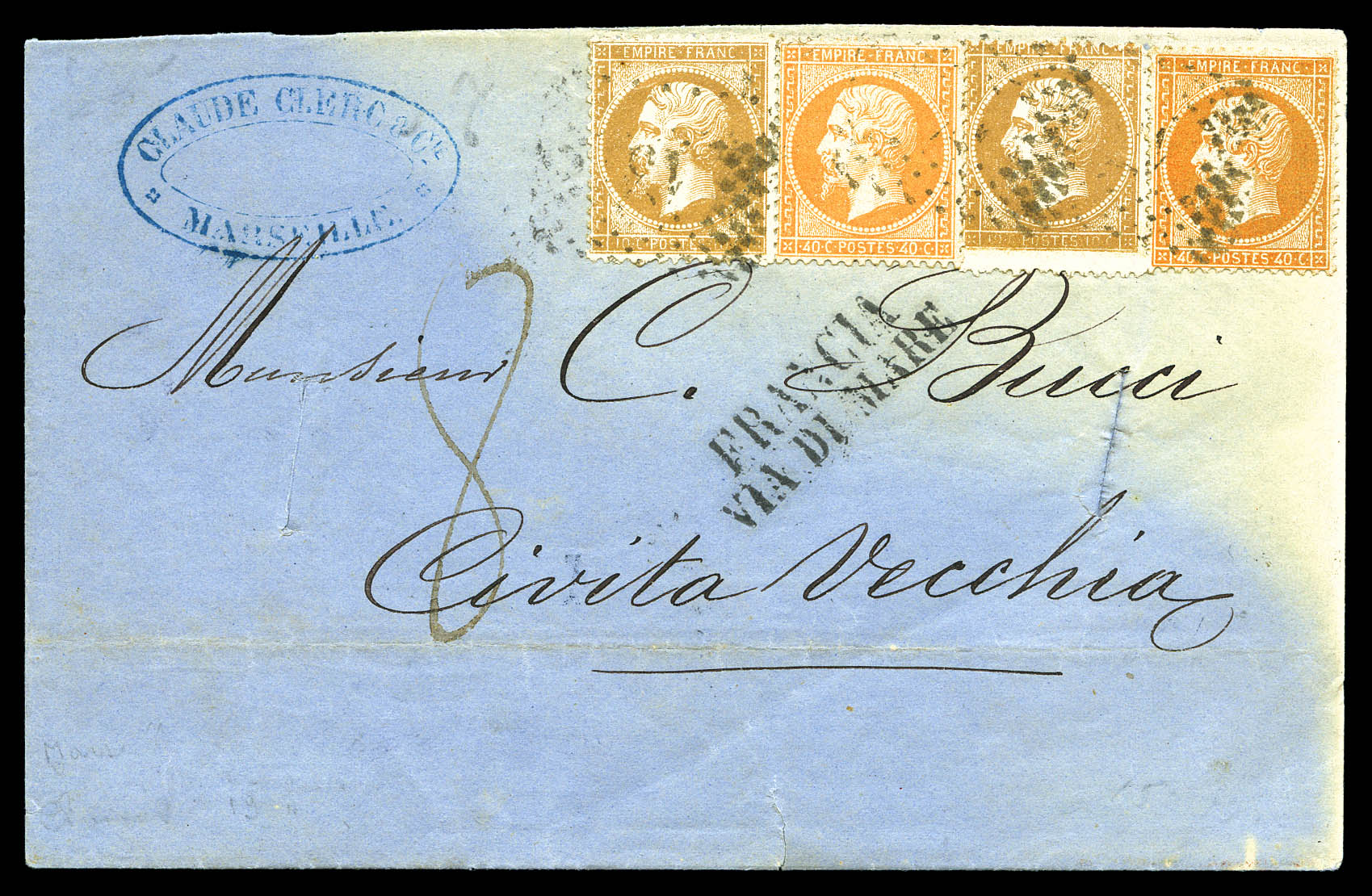 1866, Affrt composé à 1F: 10c x2ex + 40c x2ex Empire dentelé (N°21+23) obl Chiffre 13 Italien de GENOVA + griffe FRANCIA VIA DI MARE + taxe '8' sur lettre double port de Marseille pour CIVITA VECCHIA. SUP