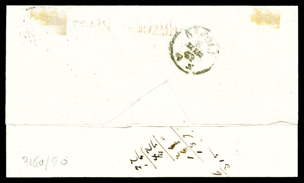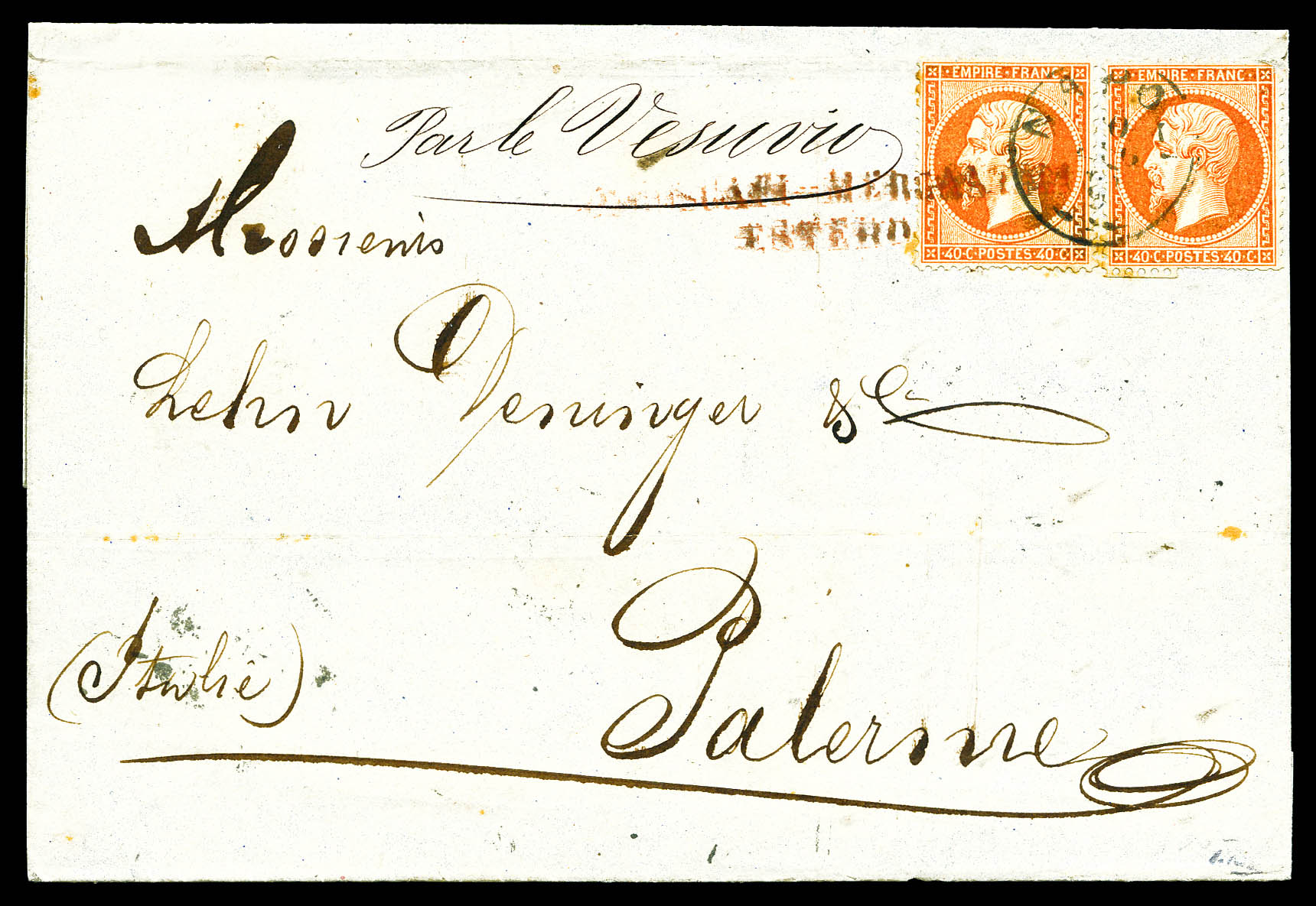 N°23, 1863, 40c dentelé x 2 exemplaires (1 pd) oblitérée cercle NAPOLI + griffe rouge 'PIROSCAFI MERCANTILI ESTERO' sur lettre double port de Marseille pour Palerme. TB (signée/certificat) Qualité: Oblitéré (Image) (imagea)