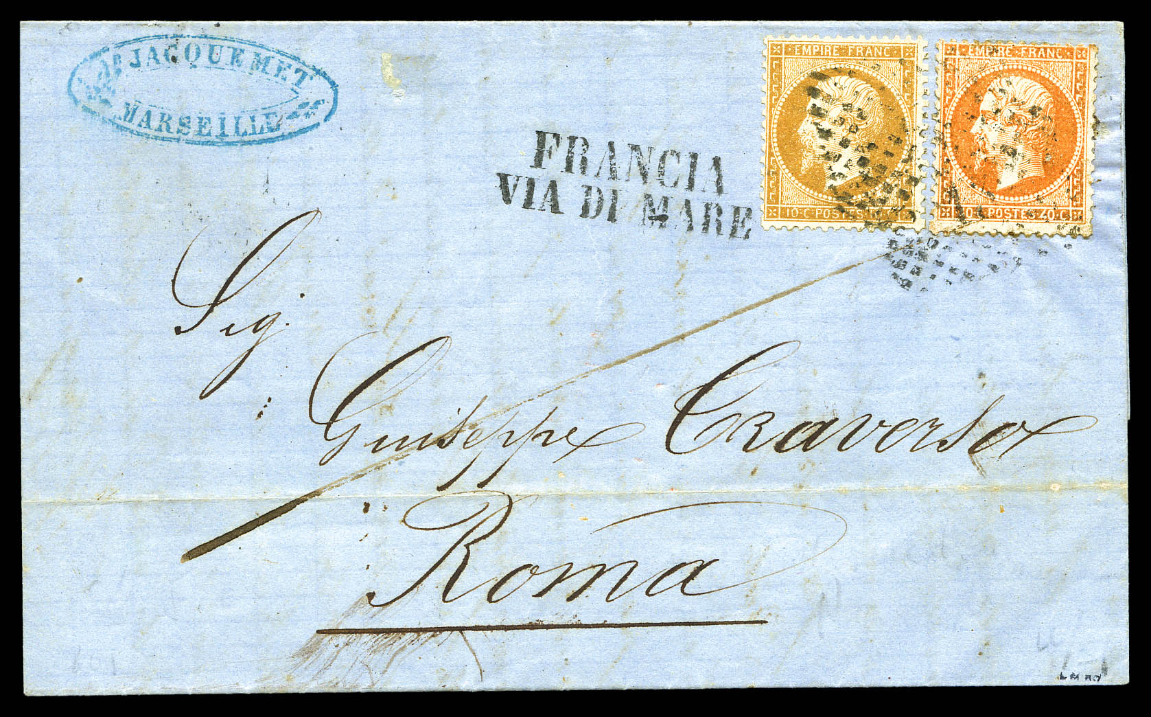 1867, Affrt composé à 50c: 10c + 40c Empire dentelé (N°21+23) obl Chiffre 13 Italien de GENOVA + griffe FRANCIA VIA DI MARE sur lettre de Marseille pour ROME. SUP (signé Margues/certificat) Qualité: Oblitéré (Image) (imagea)