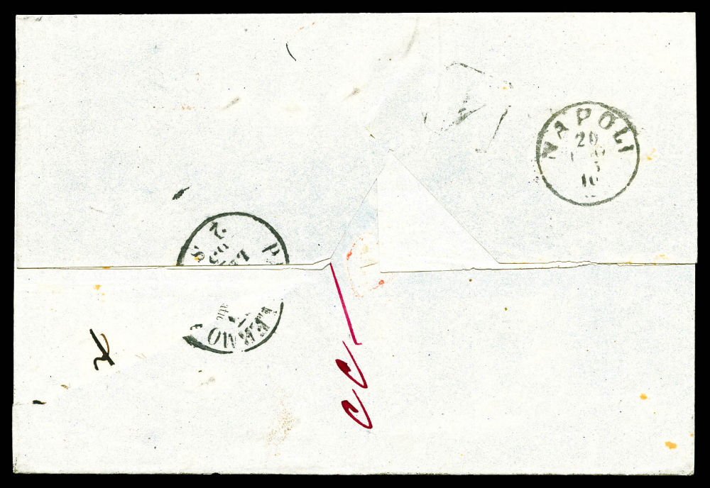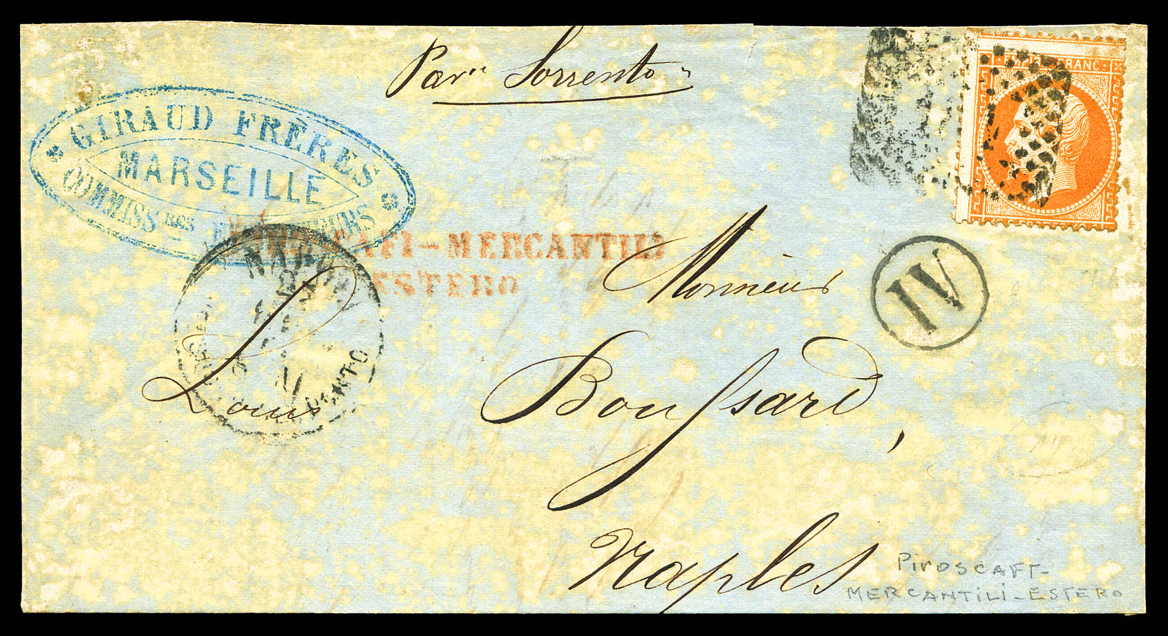 N°23, 40c Empire dentelé obl rectangle de Points 19 de Naples + griffe rouge 'PIROSCAFI MERCANTILI ESTERO' sur lettre de Marseille pour Naples. SUP. (certificat) Qualité: Oblitéré (Image) (imagea)