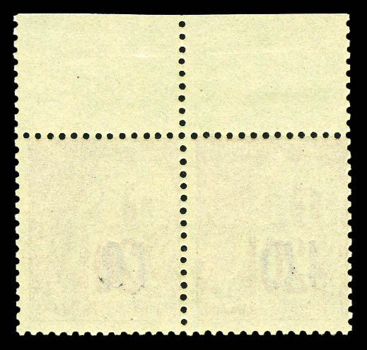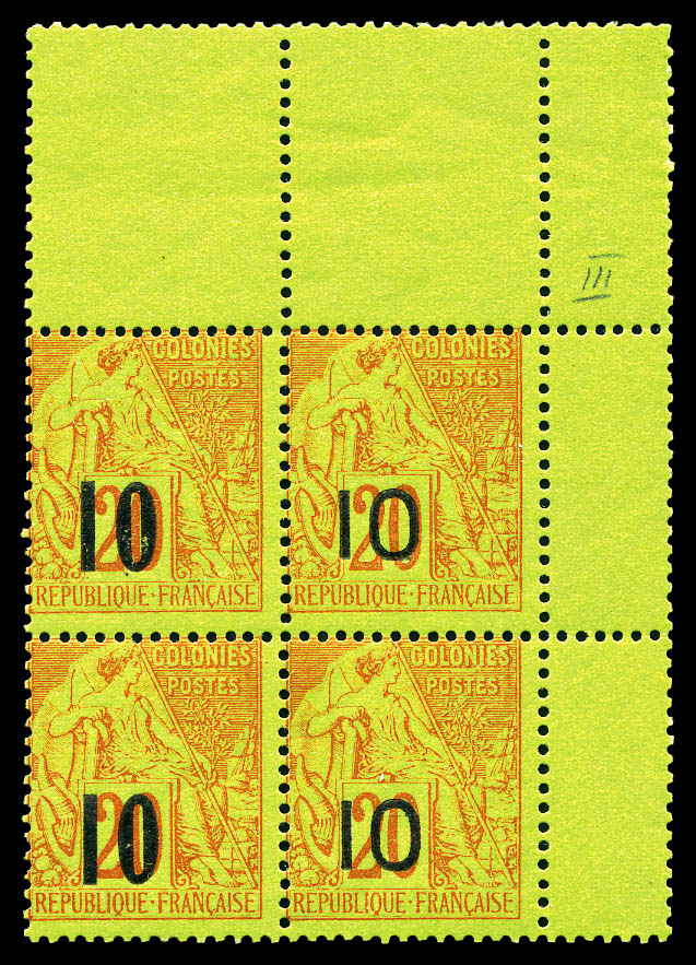 N°4A et 4F, 10 sur 20c brique sur vert: 2 paires Types II et VII se tenant en bloc de quatre coin de feuille, fraîcheur postale.