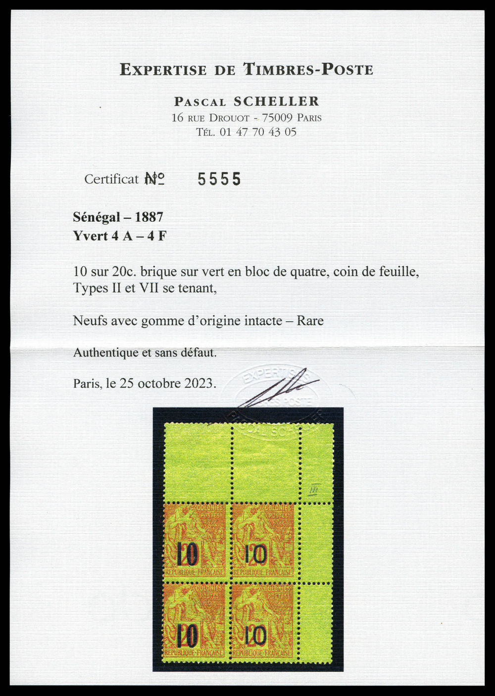 N°4F, 10 sur 20c brique s vert Type VII. SUP. R. (certificat) Qualité: ** Cote: 2100 euros (Image)