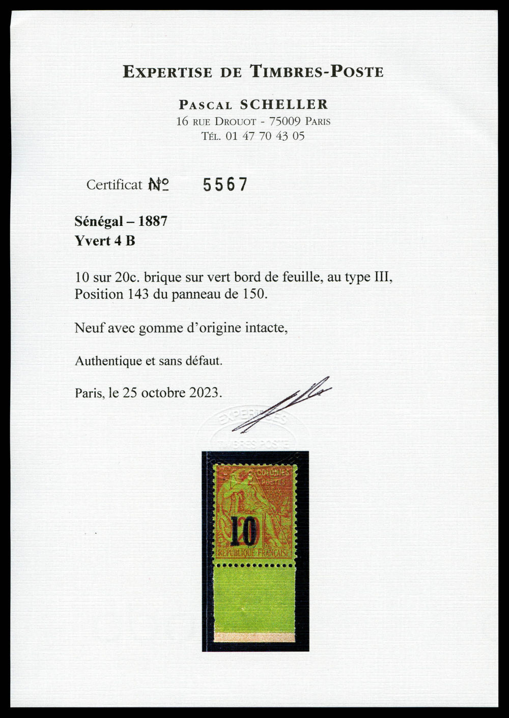 N°4B, 10 sur 20c brique sur vert TYPE III, bas de feuille (position 143 du panneau), fraicheur postale. SUPERBE. R.R. (certificats)