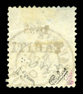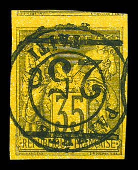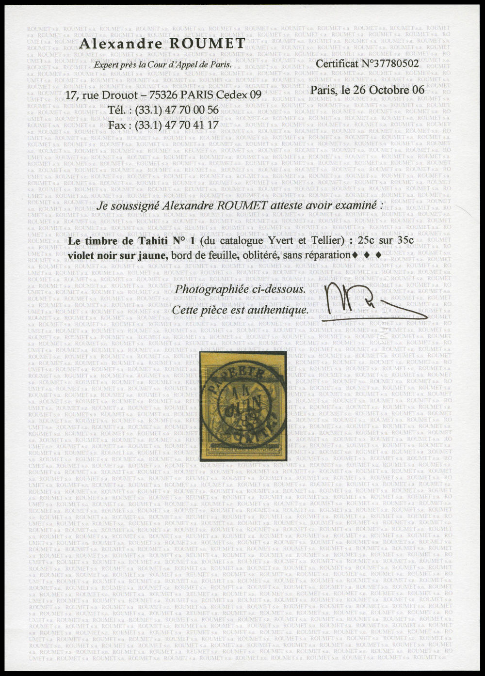 4026 imageN°1, 25c sur 35c violet-noir s jaune obl PAPETTE du 14/6/1882, grandes marges. SUP (signé Calves/certificats) Qualité: Oblitéré Cote: 630 euros (Image) (imagea) (All Images)