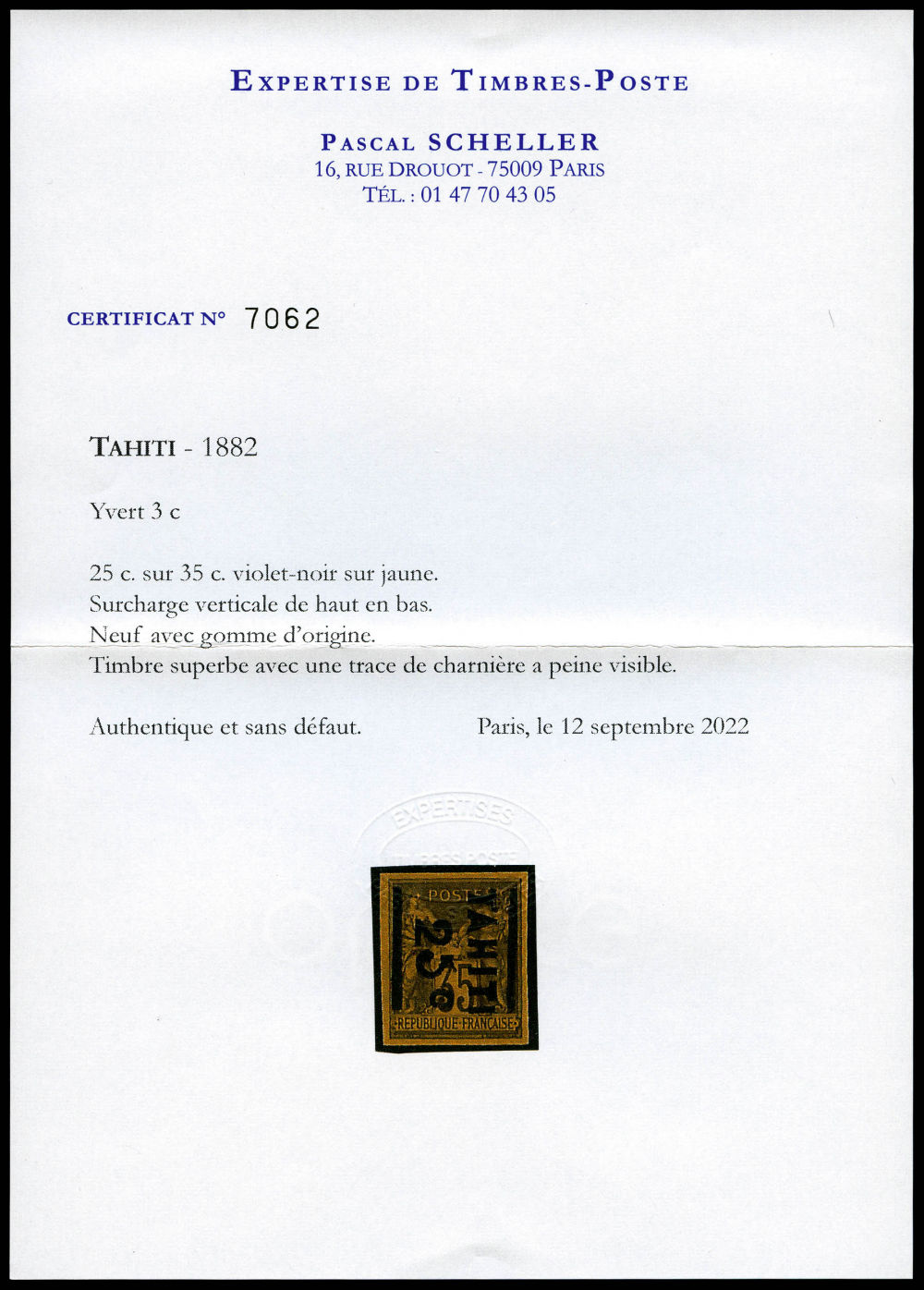 4029 og imageN°3c, 25c sur 35c violet-noir sur jaune, surcharge de haut en bas, fraîcheur postale. SUPERBE. R.R. (signé Brun/certificats) Qualité: * Cote: 7350 euros (Image) (imagea) (All Images)