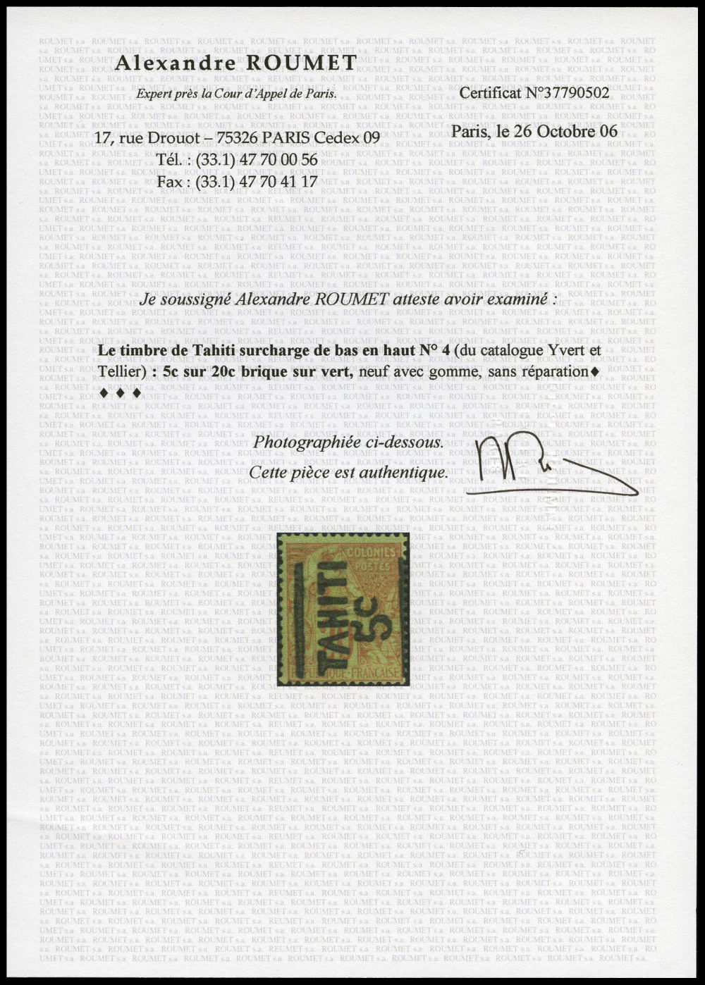 4030 og imageN°4a, 5c sur 20c, surcharge renversée bdf, très bon centrage. SUP (certificat) Qualité: * Cote: 580 euros (Image)