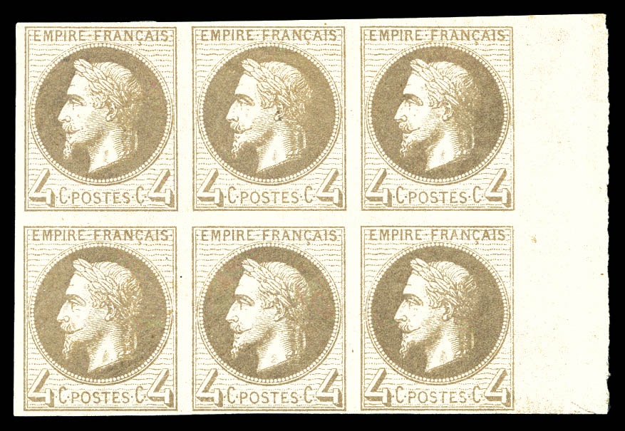 N°27, 4c Lauré: Non dentelé du dentelé en bloc de 6 exemplaires bord de feuille latéral (3 ex*). SUP. R. (certificat) Qualité: ** (Image)