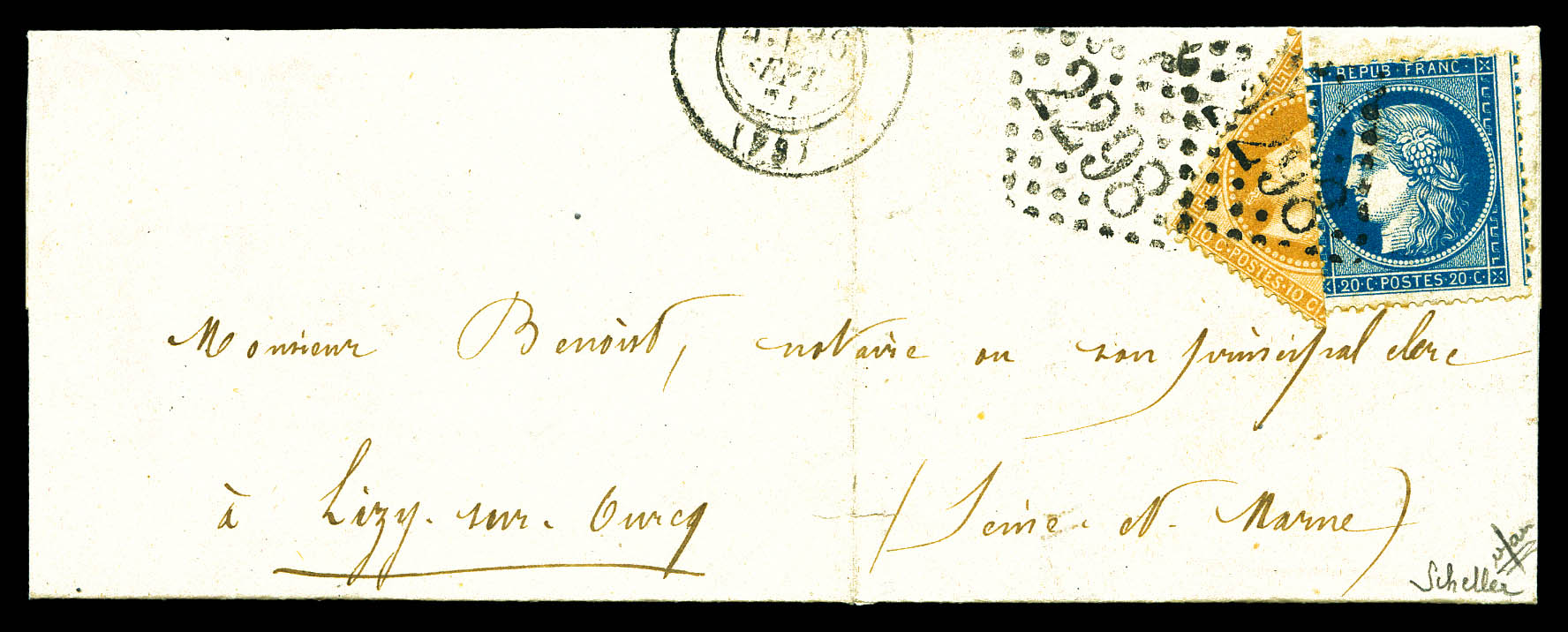 N°28B, 10c bistre coupé + 20c (N°37) obl GC 2298 sur lettre de MEAUX du 26 septembre 1871, arrivée à LIZY SUR OURCQ le 27 sept. SUP. R.R. (signé Scheller/certificat) Qualité: Oblitéré Cote: 8500 euros (Image)