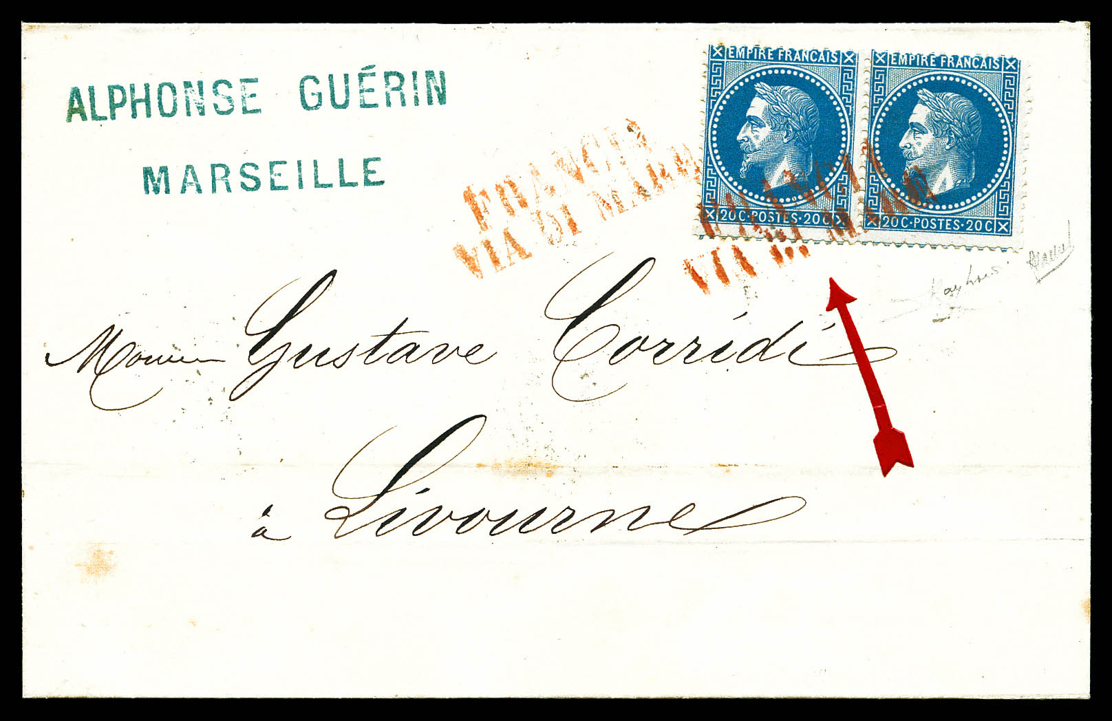 N°29, 1868, 20c Lauré en paire sur lettre à destination de LIVOURNE obl 'FRANCIA VIA DE MARE' EN ROUGE, SUP (signé Jamet/certificat) Qualité: Oblitéré (Image) (imagea)