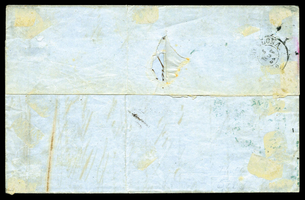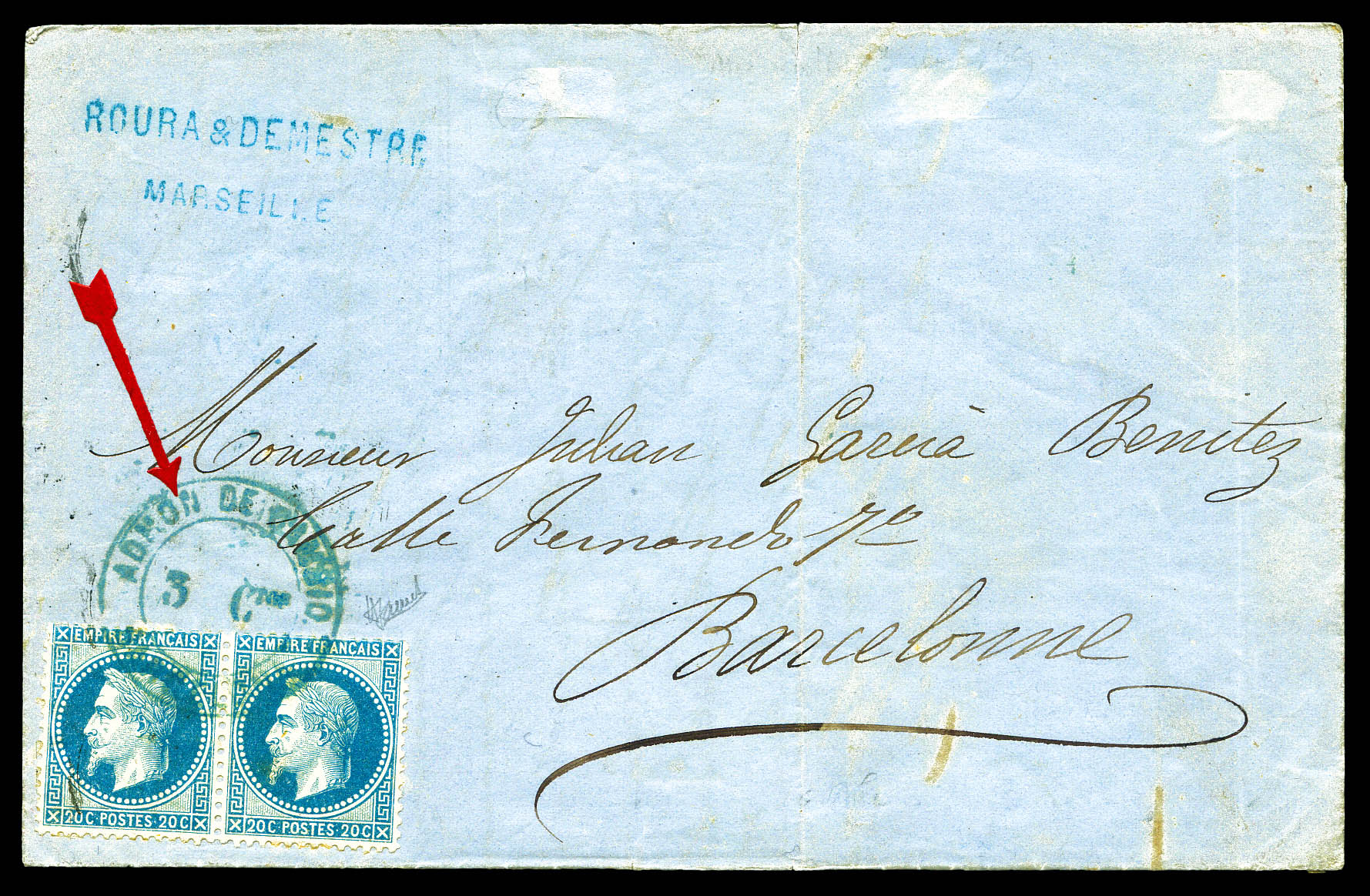 N°29, 1869, 20c lauré en paire obl Cachet bleu ADMON DE CAMBIO BARCELONA' 3Cvos/France sur lettre de Marseille. TTB (certificat) Qualité: Oblitéré (Image) (imagea)