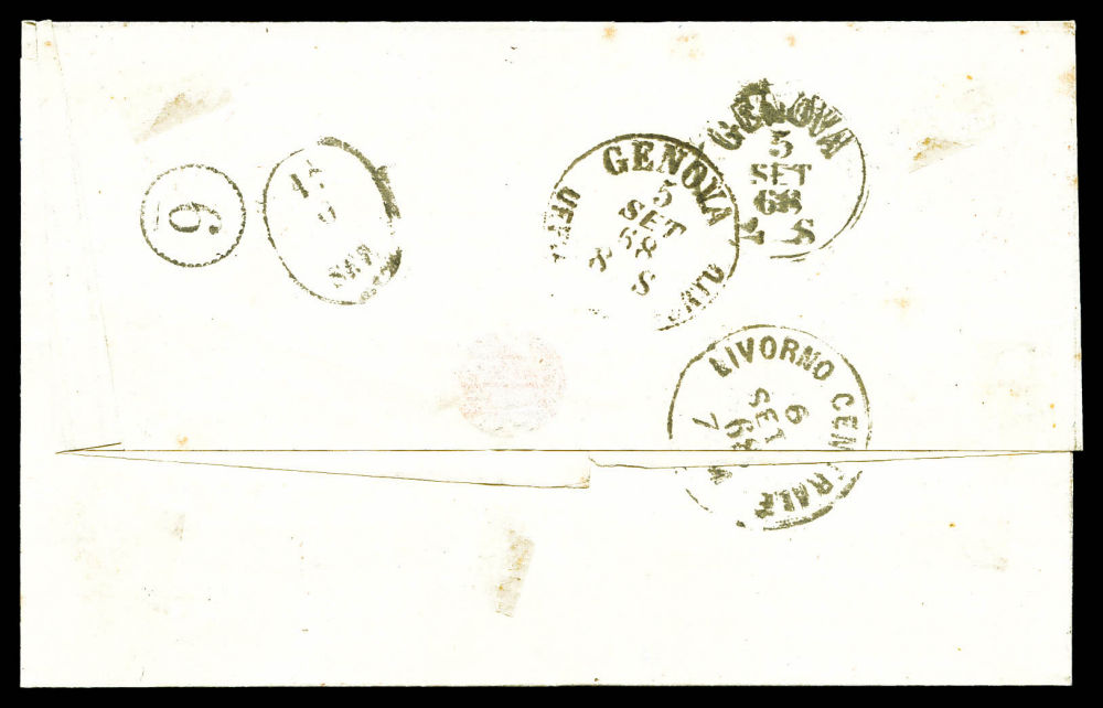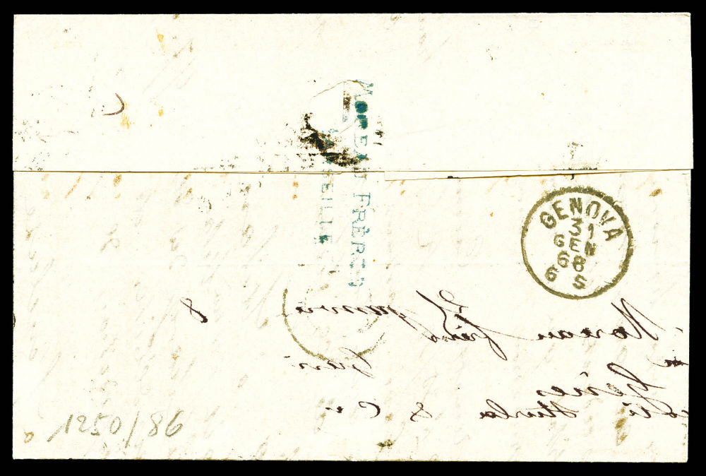 1866, Afft Composé: 20c Empire dentelé + 20c Lauré sur lettre à destination de GENES obl 'FRANCIA VIA DE MARE', TB (certificat) Qualité: Oblitéré (Image) (imagea)