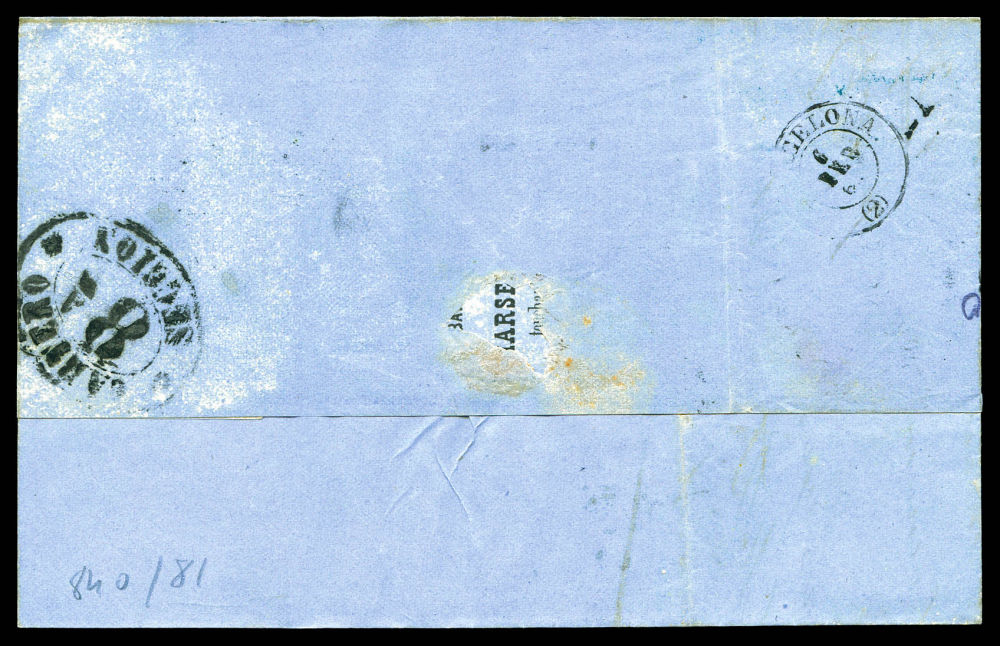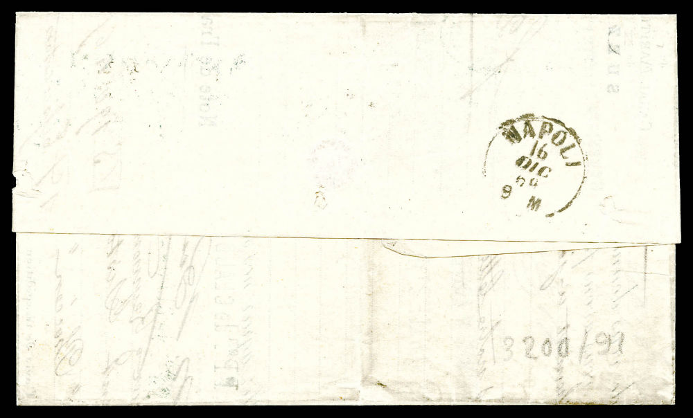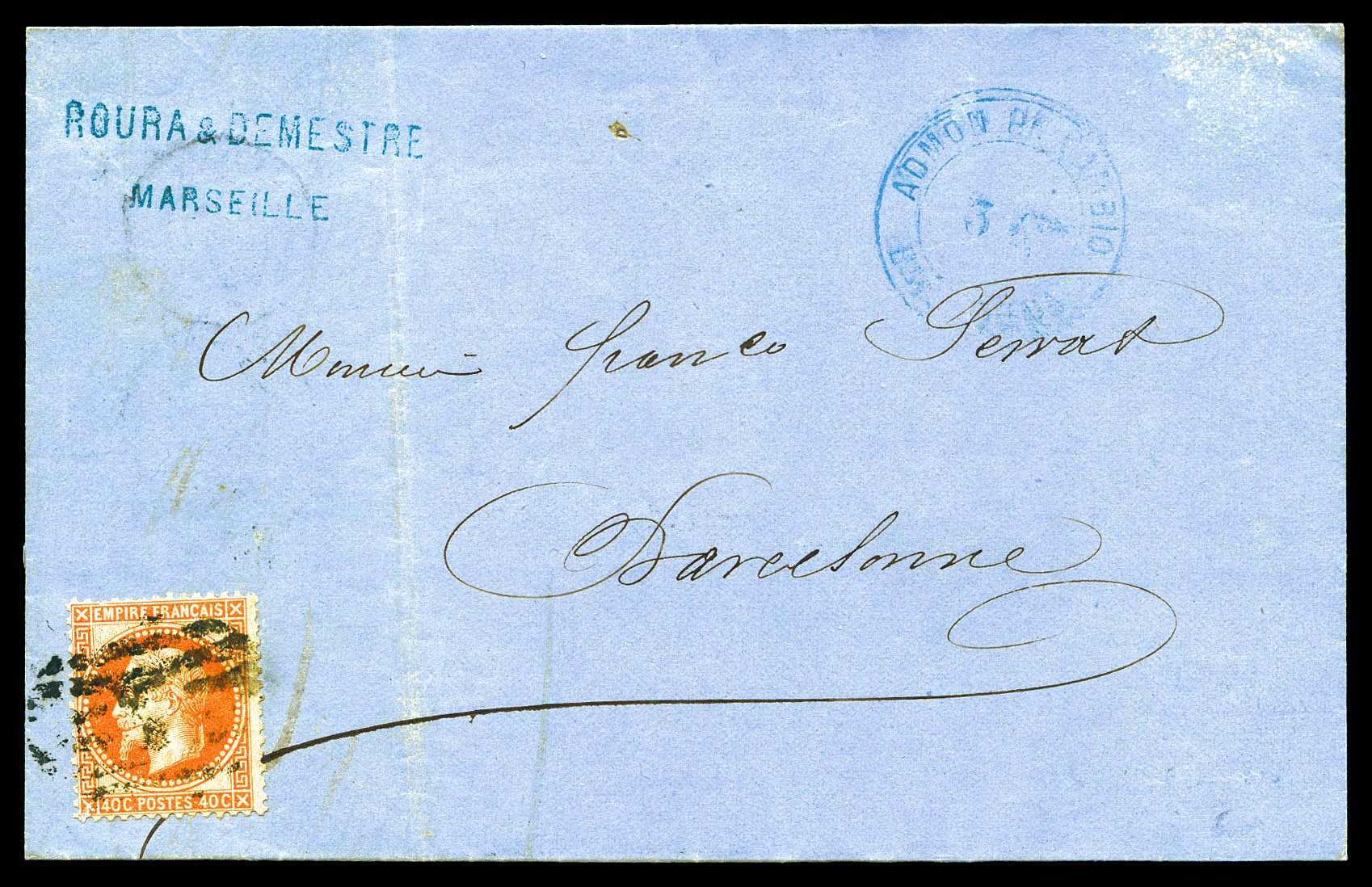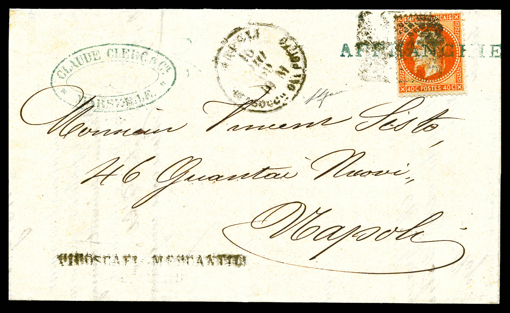 N°31, 40c. Lauré obl. GC ITALIEN '184' et griffe bleue AFFRANCHIE + griffe PIROSCAFI MERCANTO +càd NAPOLI l sur lettre de Marseille pour Naples, TTB (certificat) Qualité: Oblitéré (Image) (imagea)
