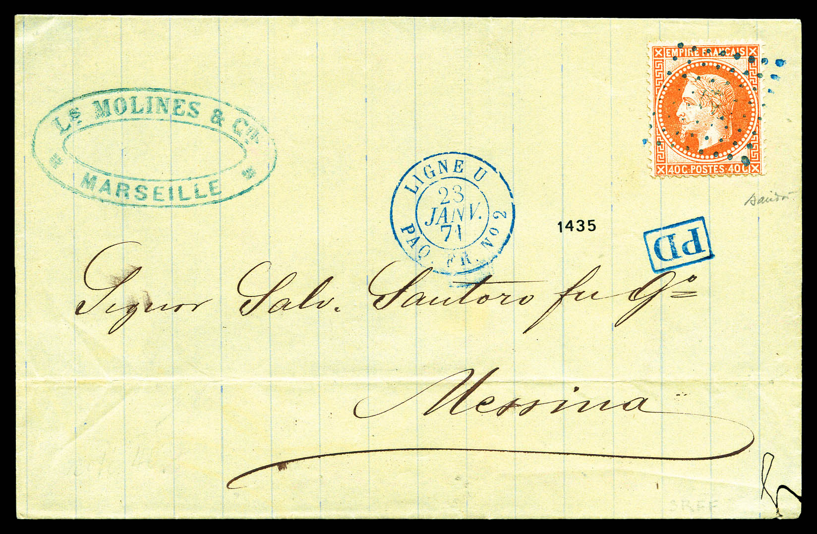 N°31, 40c orange obl ancre bleue + càd ligne U/Paq. Fr. n° 2 et PD sur lettre du le 28 janv 71 à destination de Messine. TTB Qualité: Oblitéré (Image)