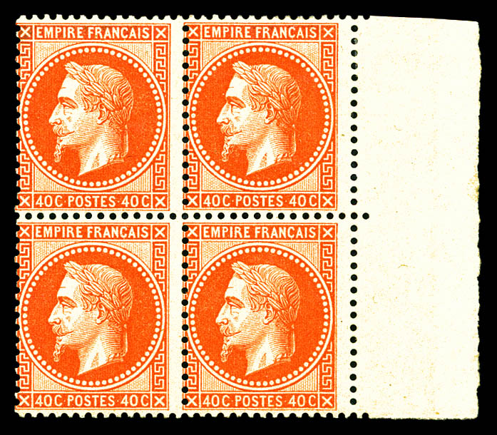 N°31b, 40c orange-vif en bloc de quatre bord de feuille latéral (1ex*), grande fraîcheur. SUP. R. (signé Calves/certificat) Qualité: ** (Image)