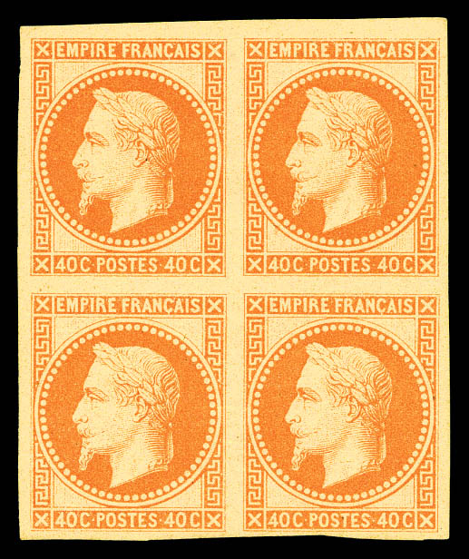 N°31c, Rothschild, 40c orange non dentelé, bloc de quatre. SUP (signé Calves/certificat) Qualité: * Cote: 1480 euros (Image)
