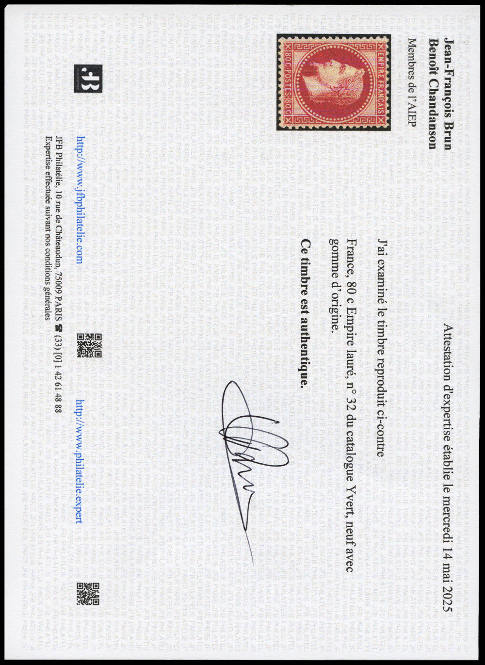 N°32, 80c rose, frais, TB (signé Brun/certificats) Qualité: * Cote: 1950 euros (Image) (imagea)