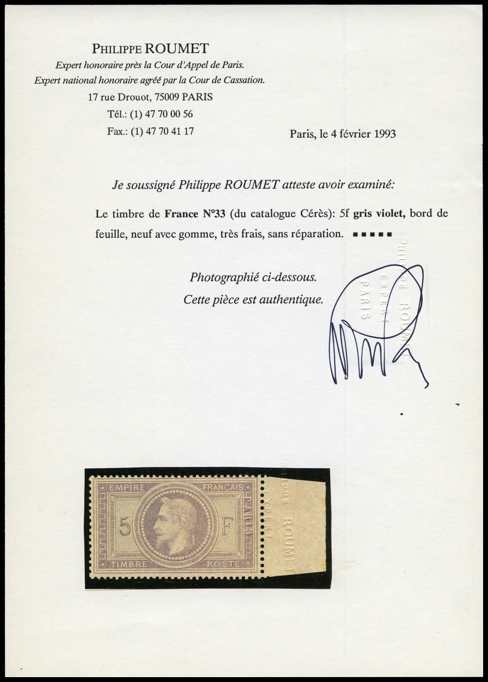 N°33, Empire, 5F violet-gris, fraîcheur postale, très bon centrage. SUP. R. (signé/certificats) Qualité: * Cote: 9500 euros (Image) (imagea)