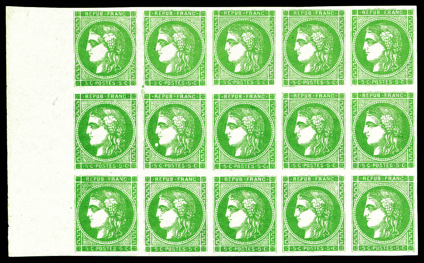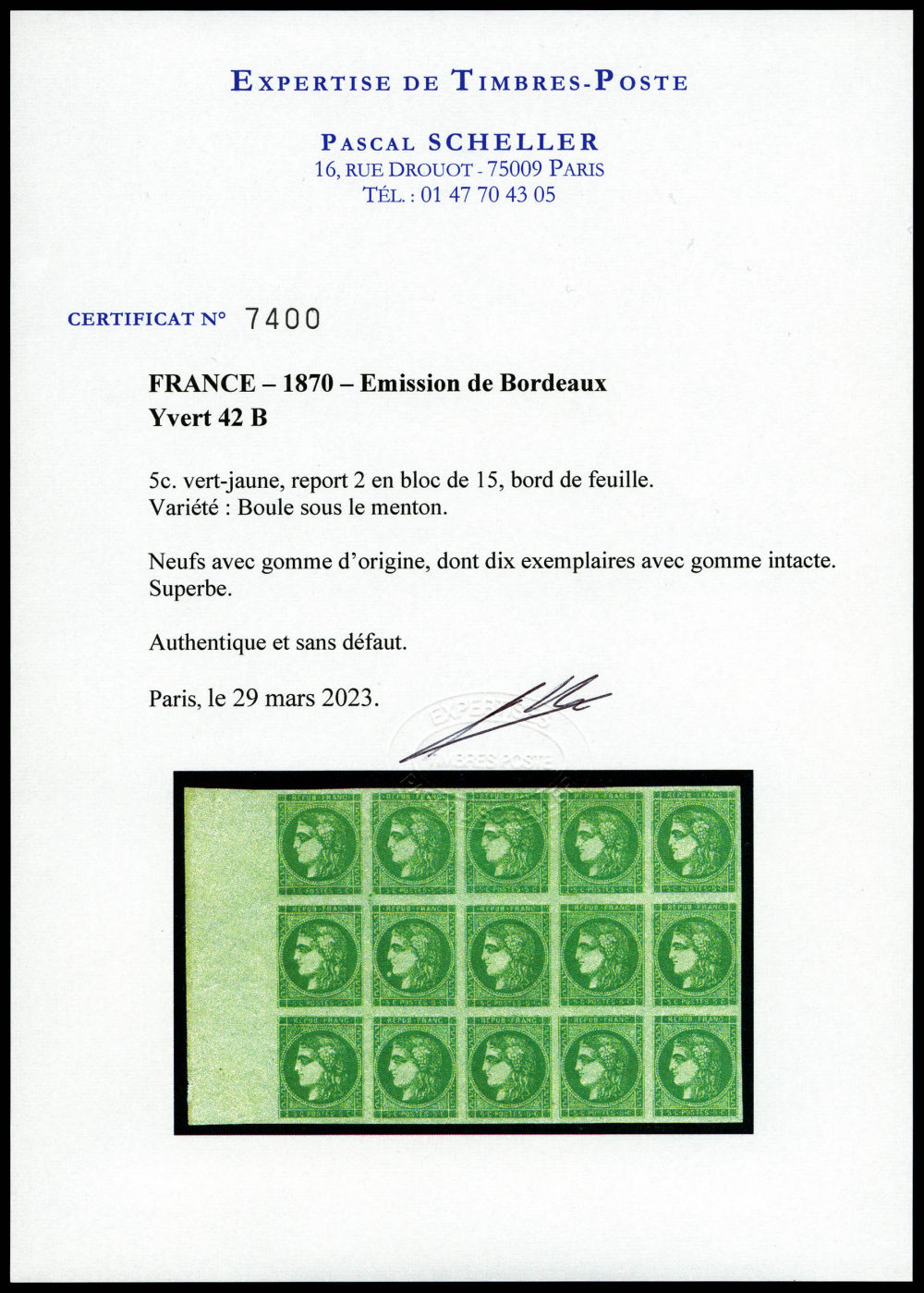 N°42B, 5c vert-jaune Report 2, bloc report complet de 15 exemplaires avec VARIETE BOULE SOUS LE MENTON (case 7), bord de feuille latéral (5ex*). SUPERBE. R.R. (certificat) Qualité: ** (Image) (imagea)