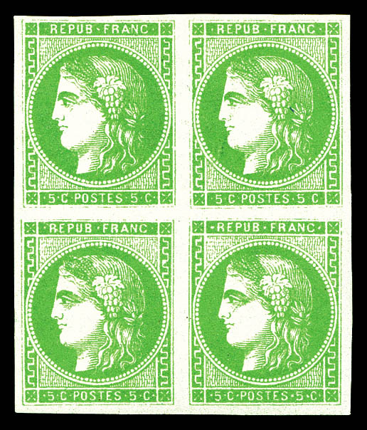 N°42A, 5c vert-jaune Report 1 en bloc de quatre (positions 1, 2, 6, 7), (2ex*). FRAÎCHEUR POSTALE. GRANDE RARETE DE LA PHILATELIE FRANCAISE, SUPERBE (signé Calves/certificats) Qualité: ** (Image) (imagea)