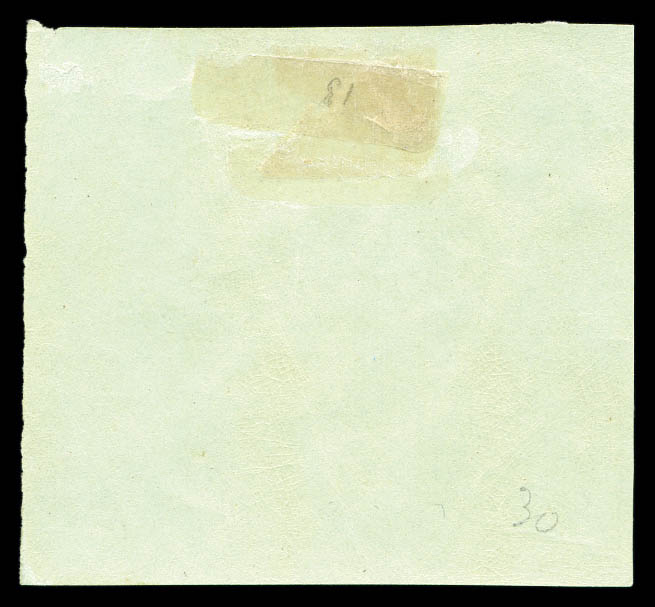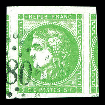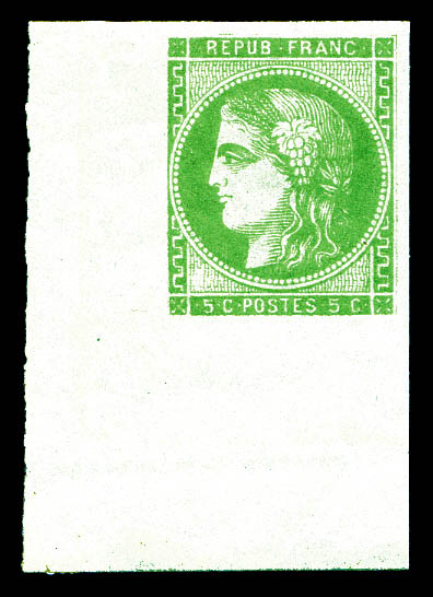 N°42B, 5c vert-jaune Report 2, coin de feuille intégral avec PETITS CHIFFRES '8' en marge, PIECE EXCEPTIONELLE. SUPERBE. R.R. (certificat) Qualité: ** (Image)