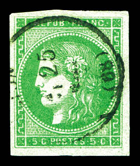 N°42B, 5c vert, obl GC, grandes marges avec 2 voisins, SUPERBE (signé Calves/certificat) Qualité: Oblitéré