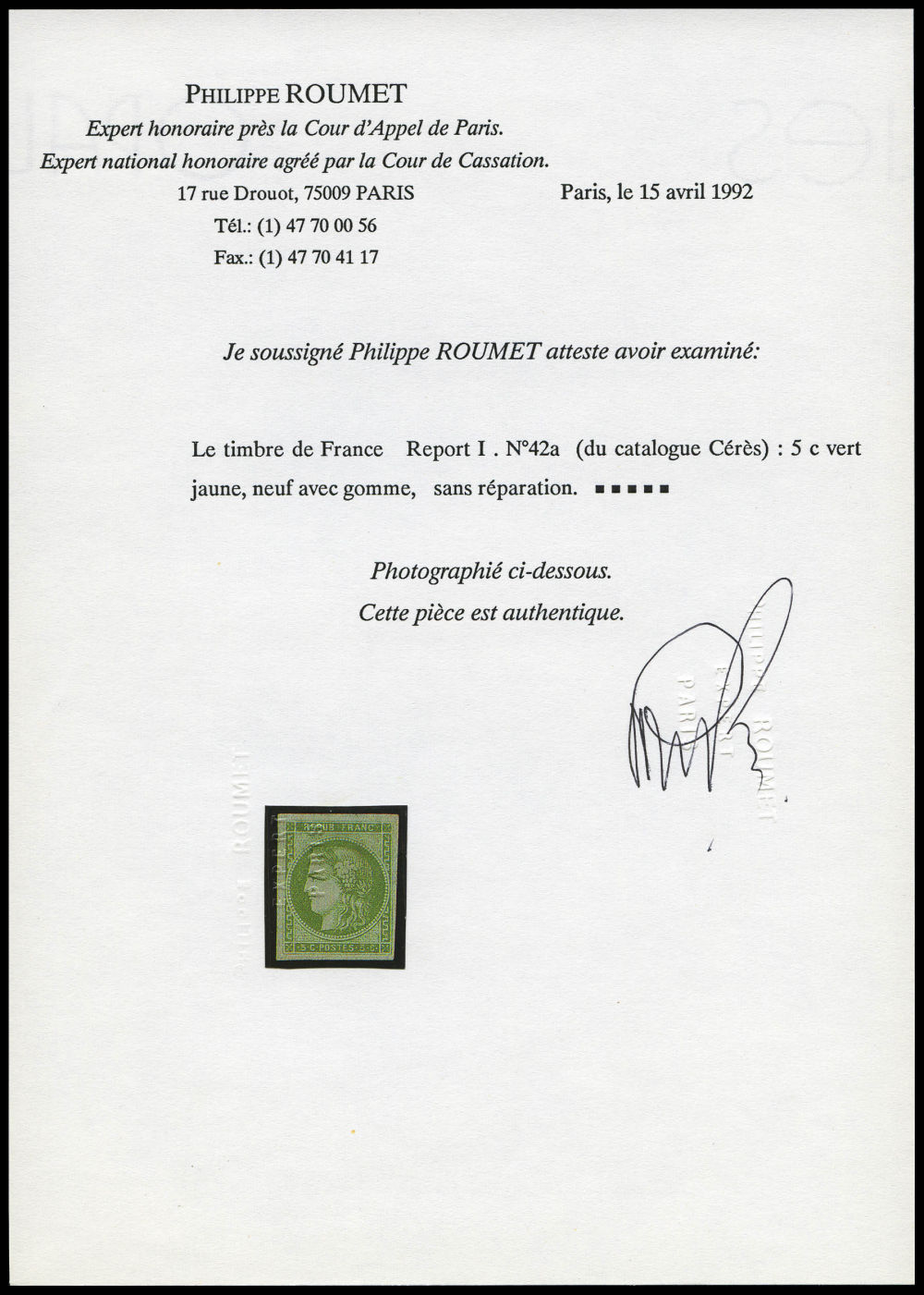 N°42A, 5c vert-jaune Report 1, belles marges, fraîcheur postale, R.R.R (signé/certificats) Qualité: * Cote: 6000 euros (Image) (imagea)