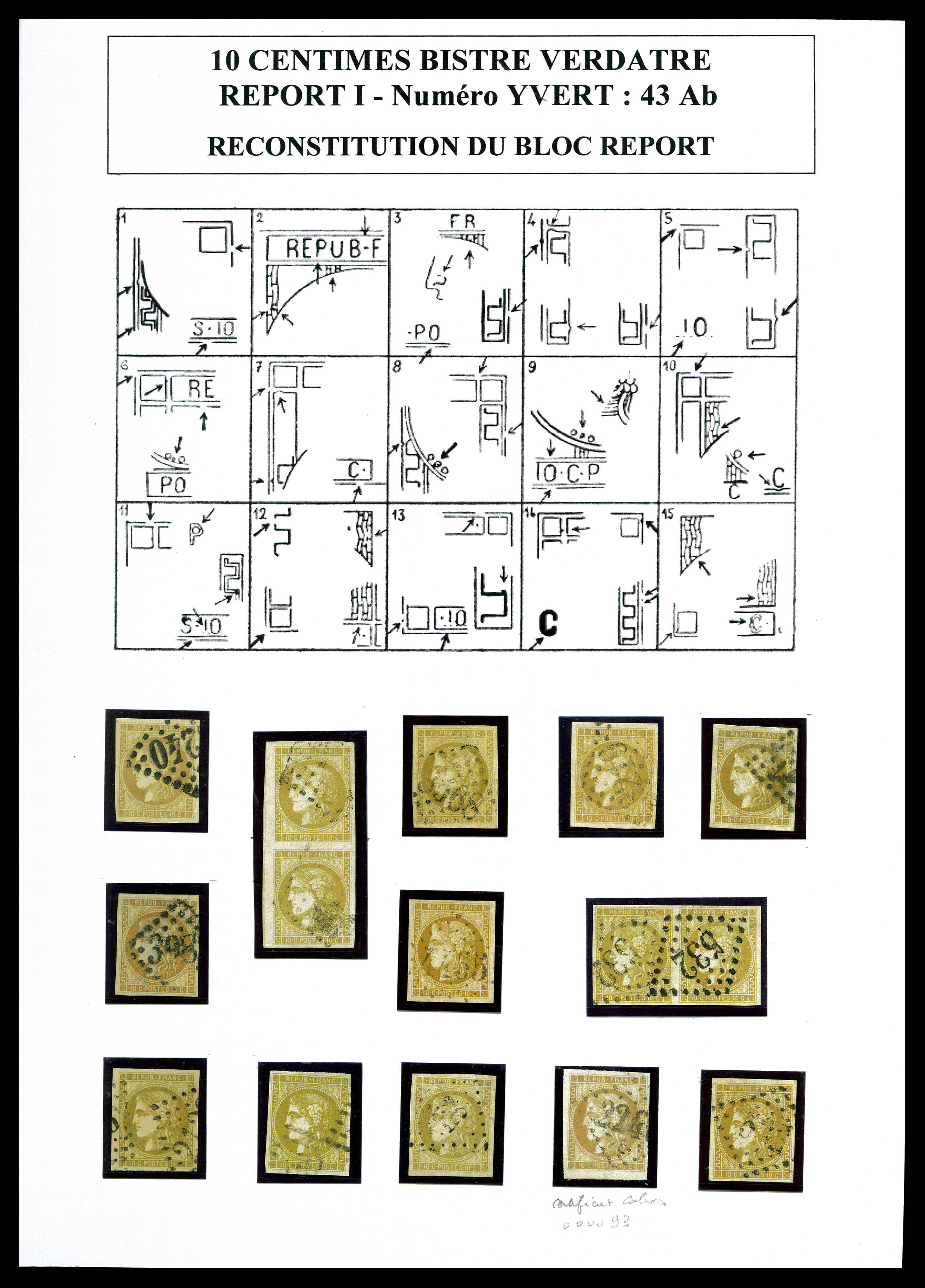 N°43Bb, 10c BISTRE VERDÂTRE Report II: Exceptionnelle reconstitution d'un bloc report complet de 15 exemplaires comprenant 2 paires horizontales, la plupart des valeurs signées, SUPERBE. R.R.R (signés