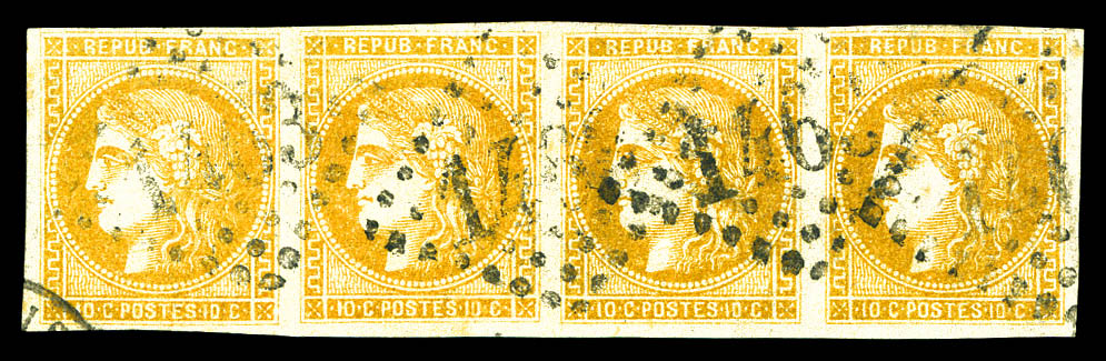 N°43B, 10c bistre-jaune Rep II, bande de quatre obl GC 1463. SUP (signé Calves/Scheller/certificat) Qualité: Oblitéré Cote: 800 euros (Image)
