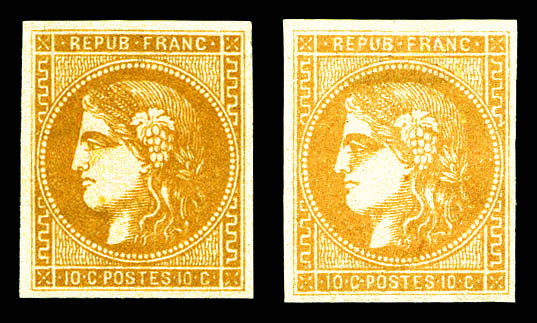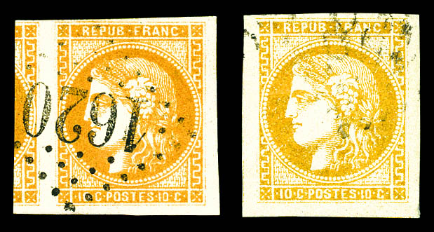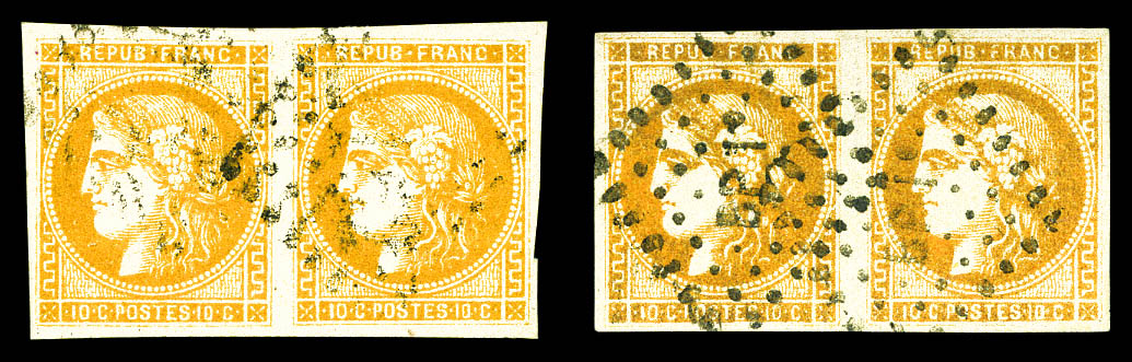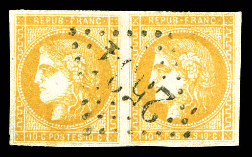 N°43B, 10c Report 2, deux exemplaires bien margés obl. étoile sur env. de Paris 14.07.71 pour Belleville sur Saône (Rhône), arr., TB. oblitération étoile rare sur Bordeaux (signé Brun/certificat) Qualité: