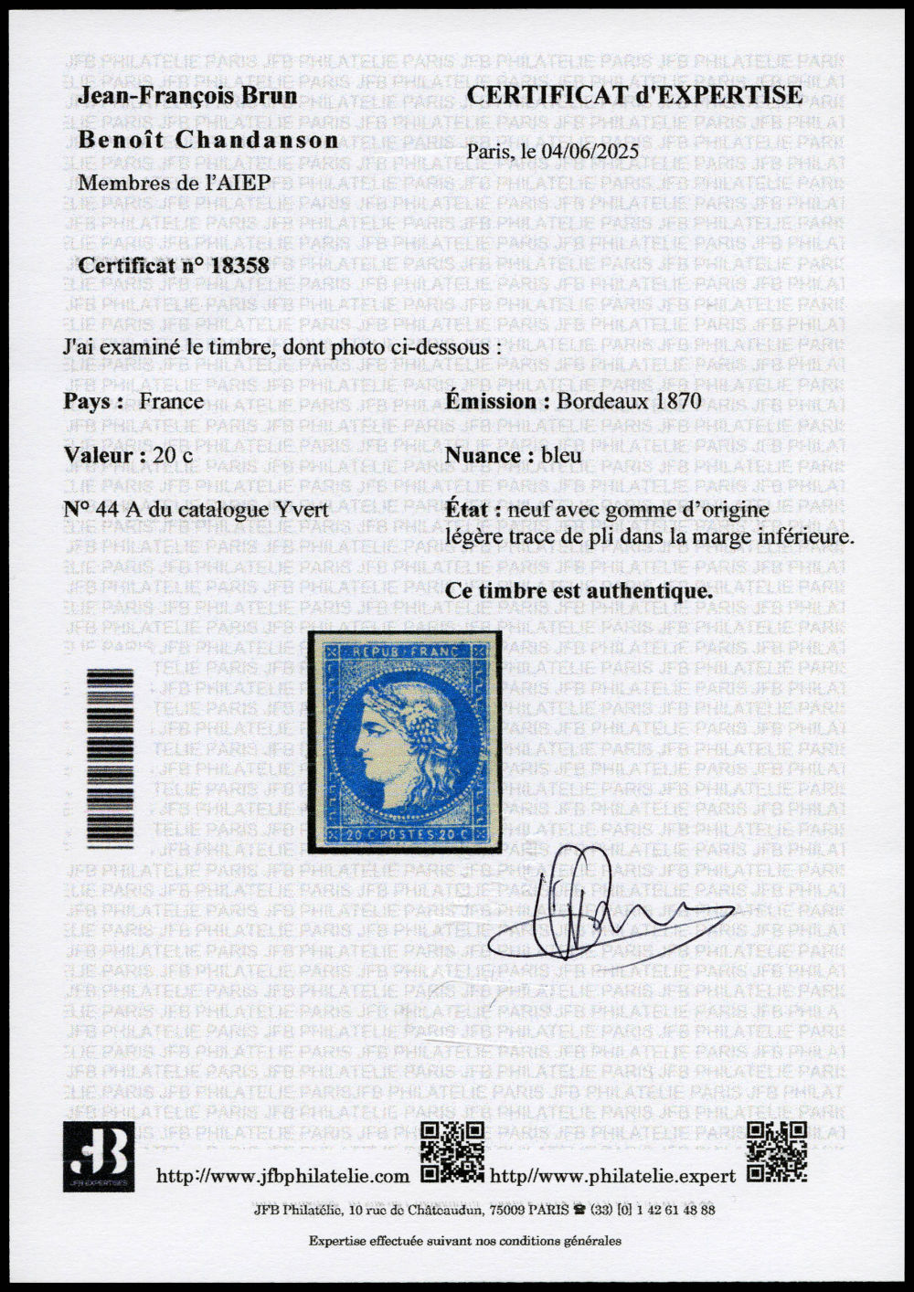 N°43B, deux nuances, dont un bdf, très frais. SUP (certificat) Qualité: ** Cote: 3000 euros (Image)