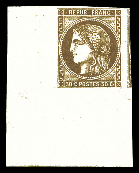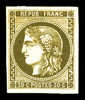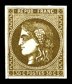 N°47c, 30c brun-verdâtre avec ligne blanche derrière la tête, quatre belle marges. SUPERBE. R.R. (signé/certificats) Qualité: * Cote: 5000 euros (Image) (imagea)